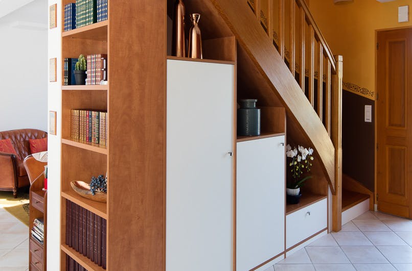 - Facilité d’utilisation et d’accès. Imaginons que vous souhaitez mettre en place un meuble sous votre escalier. Opter pour un placard sur-mesure sous-escalier sera bien plus pratique et accessible qu’un meuble classique,