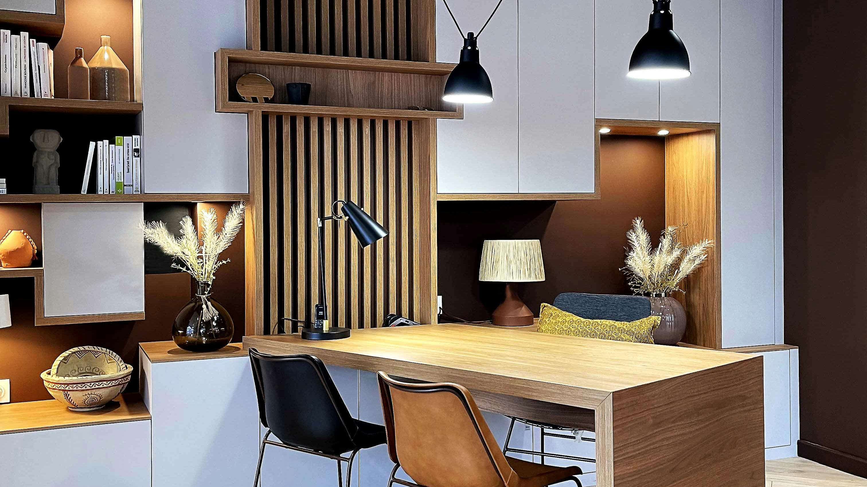Ensemble bureau & rangements en mélaminé noir et noyer doré, conçu et fabriqué par La Compagnie des Ateliers. Visible au showroom de Saint Herblain – Nantes Nord