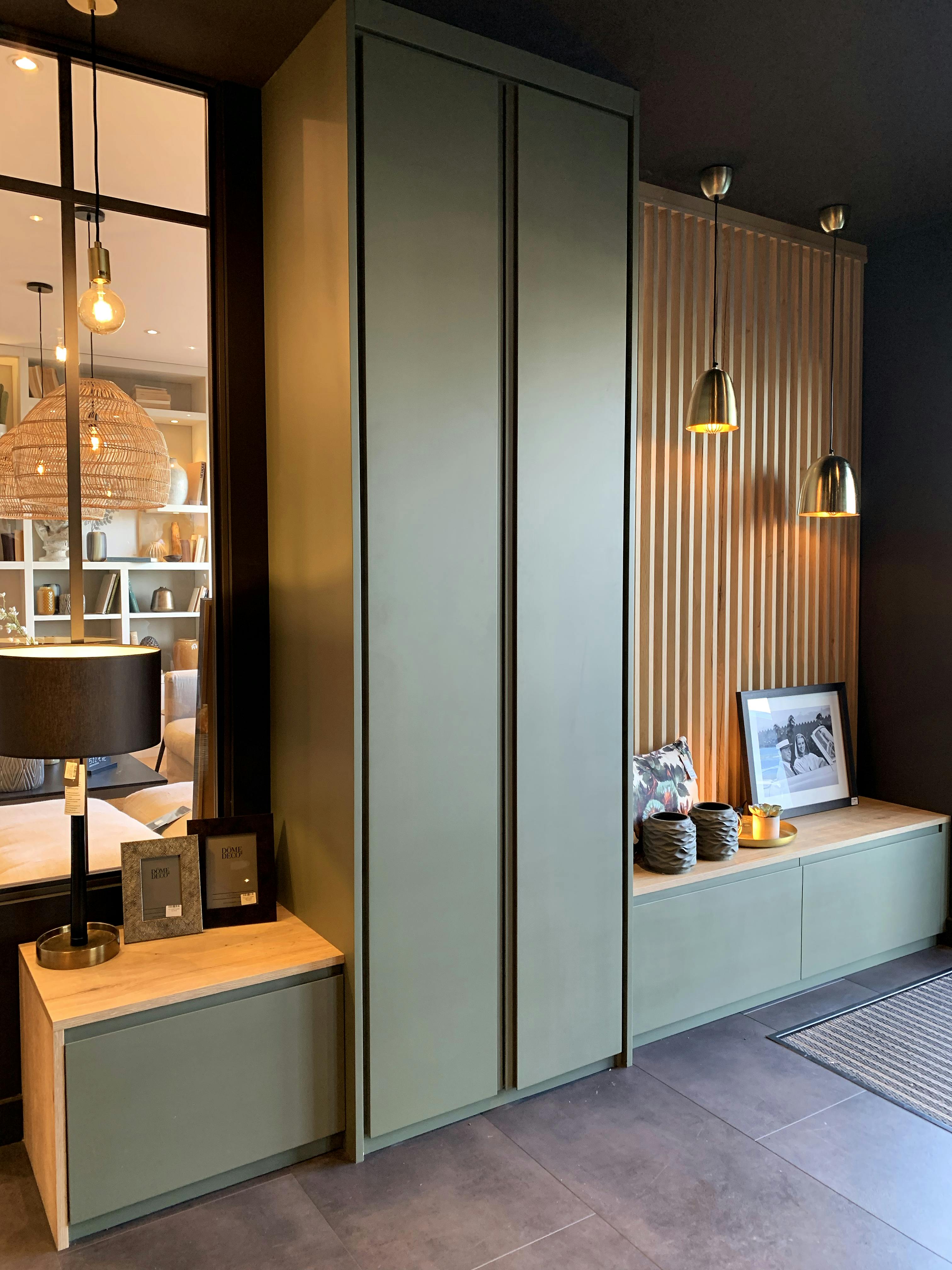 Ici un Placard d’entrée en laque mate verte et tasseaux en mélaminé noyer doré. Conçu et fabriqué par La Compagnie des Ateliers. Visible au showroom de Lorient