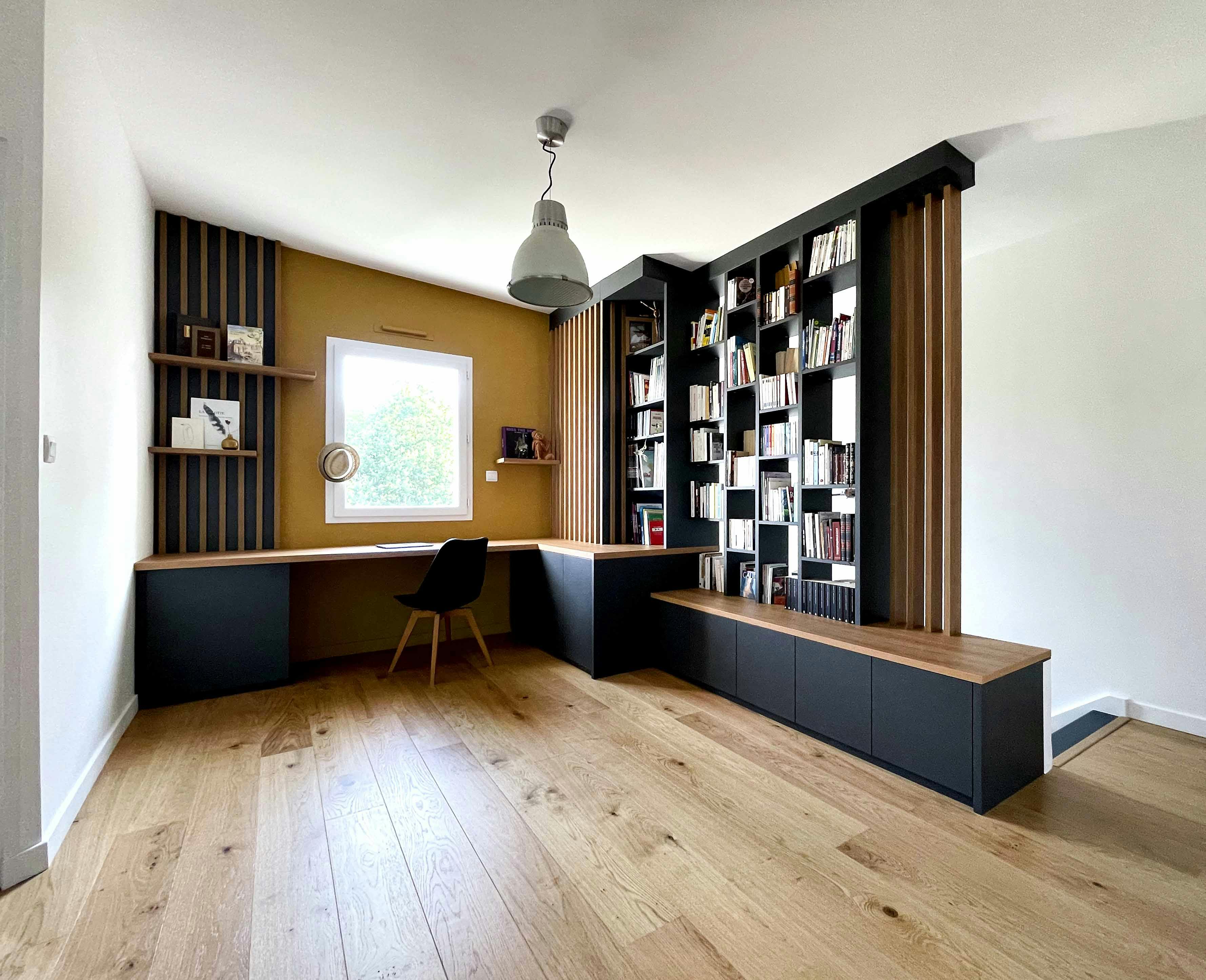 Bibliothèque en mélaminé gris anthracite et tasseaux noyer doré. Conçue et fabriquée par La Compagnie des Ateliers. Visible au showroom de Saint Herblain – Nantes Nord.