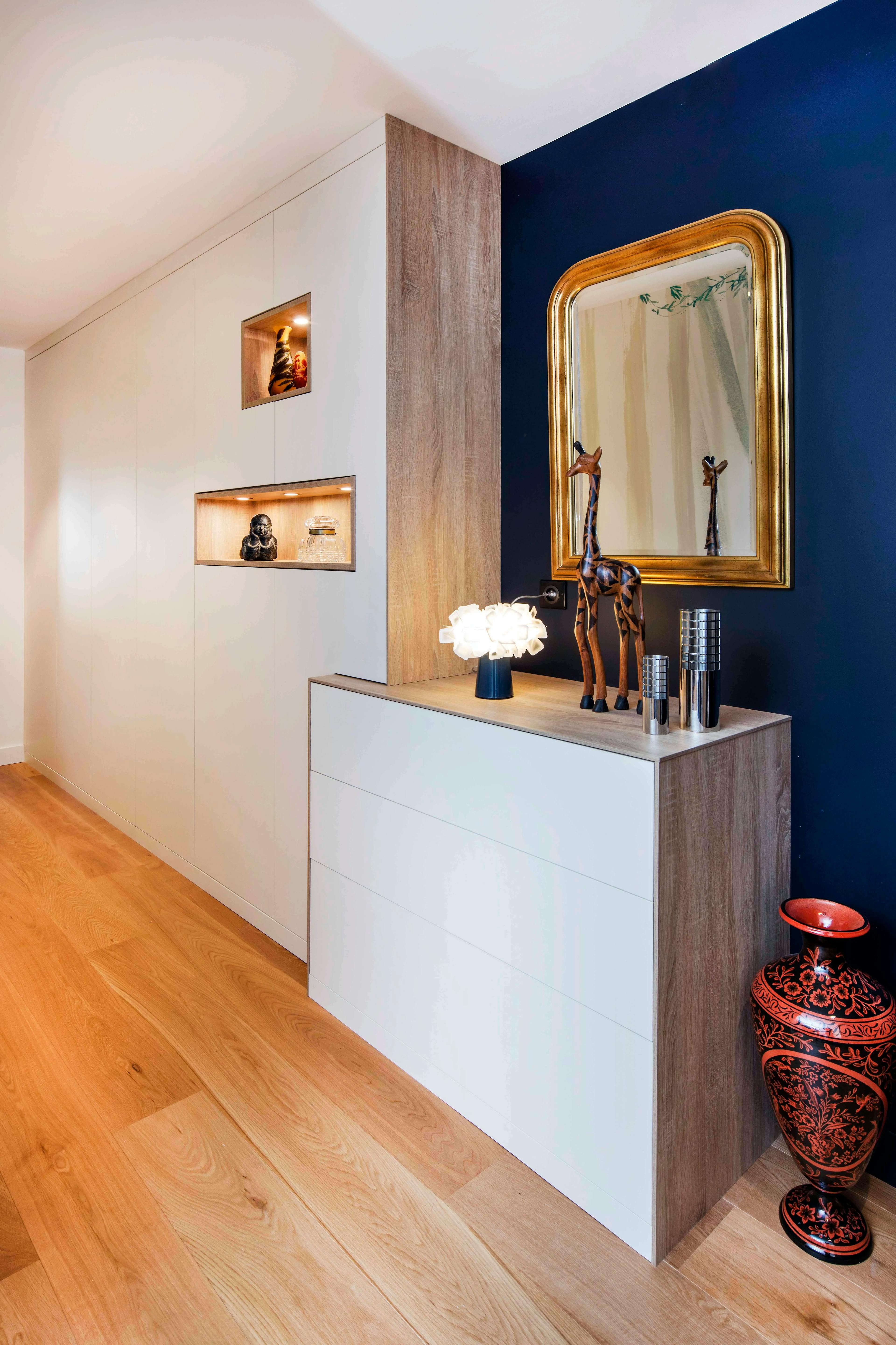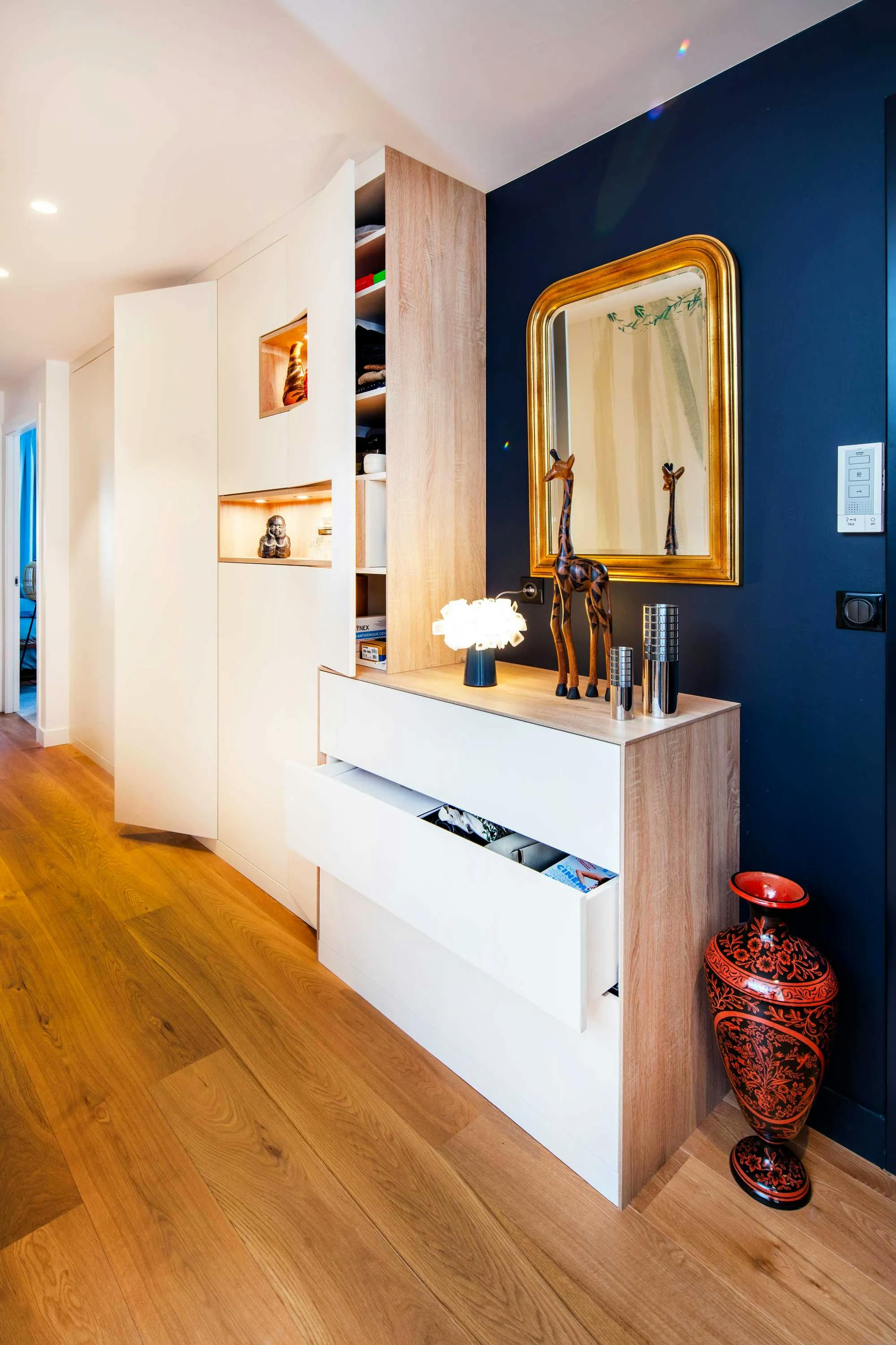 Dans une entrée exiguë, un meuble sur mesure toute hauteur est une solution idéale pour optimiser l’espace. En jouant sur les profondeurs et les modules ouverts et fermés, il apporte du rangement sans alourdir l’espace, tout en structurant visuellement l’entrée.
