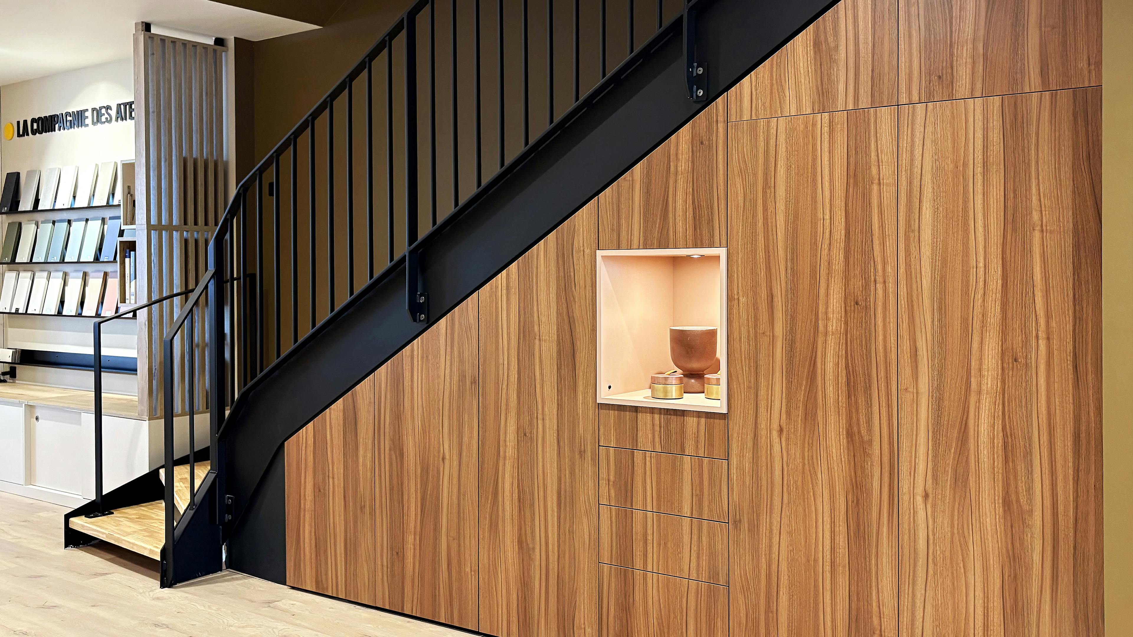 Aménager un meuble sur-mesure sous un escalier, c’est transformer un endroit souvent vide et irrégulier en un espace fonctionnel, esthétique et parfaitement adapté à votre quotidien. À La Compagnie des Ateliers, nos architectes d’intérieur et nos menuisiers agenceurs conçoivent des aménagements qui s’intègrent harmonieusement à la configuration de votre habitat, en tenant compte des contraintes techniques comme de vos usages.