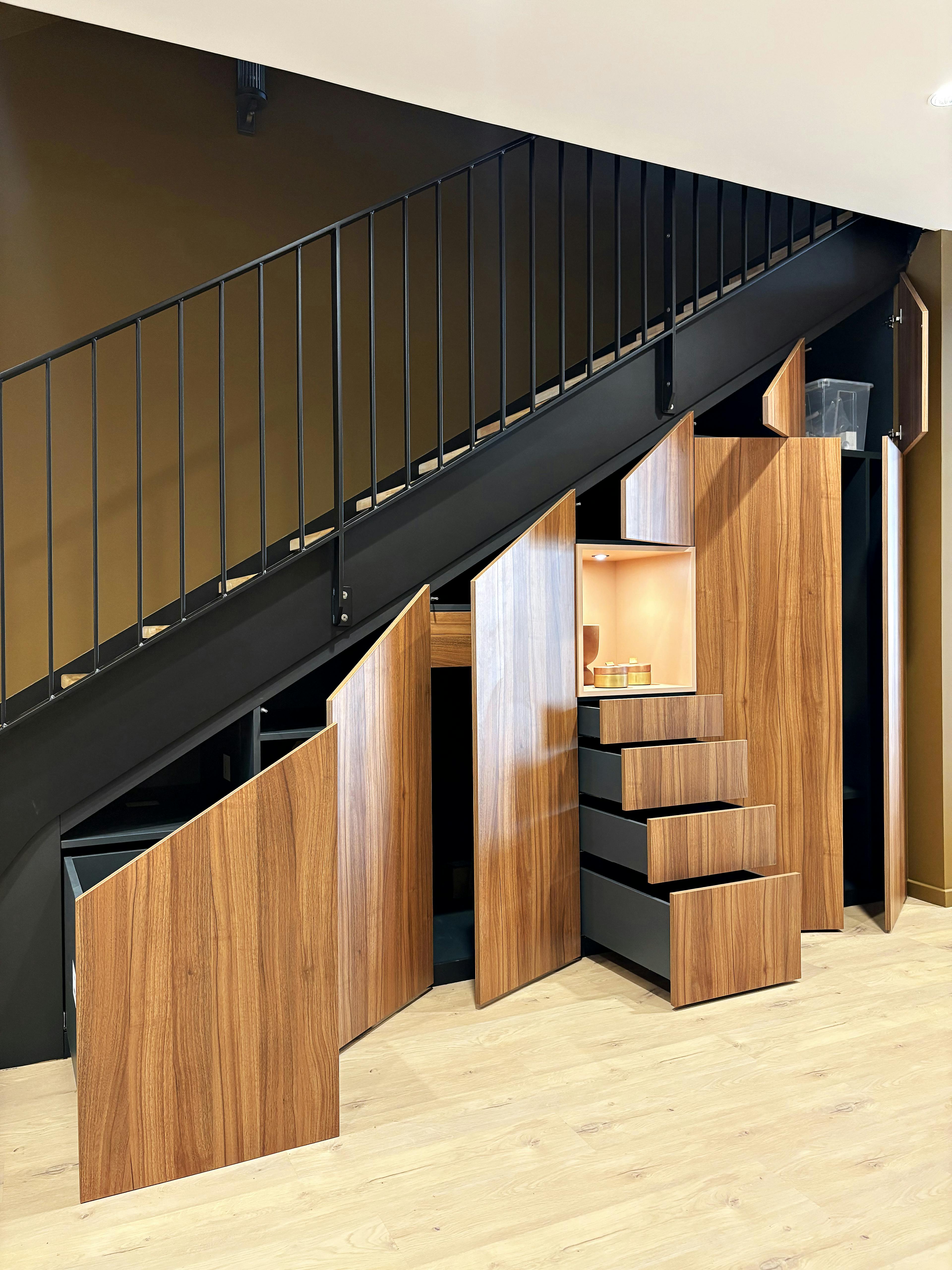 - Tiroirs sur-mesure glissant parfaitement sous les marches pour exploiter même les zones basses.