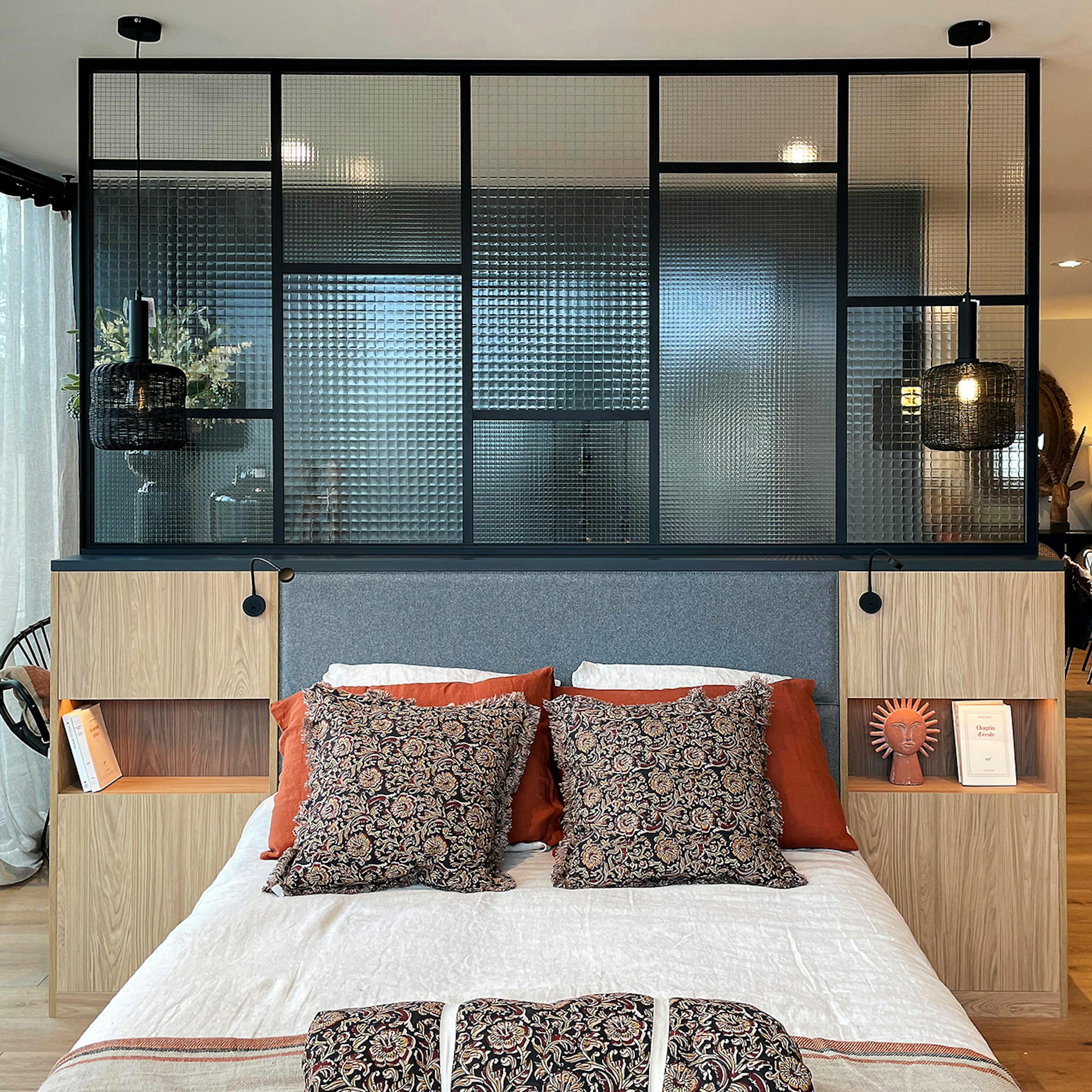 - Séparer l’espace nuit du dressing ou d’une salle de bains attenante, tout en laissant circuler la lumière.