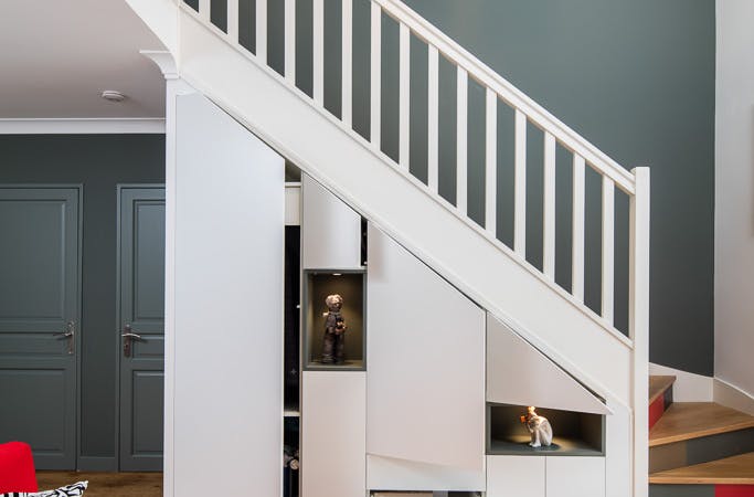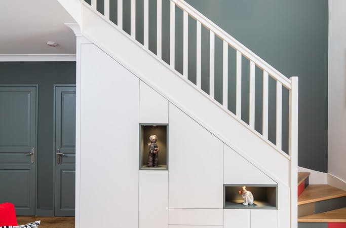 Lorsque vous créez un espace de stockage sur mesure sous un escalier, il est important de personnaliser l’aménagement en fonction de vos besoins. Par exemple, si vous souhaitez stocker des livres, vous pouvez installer des étagères avec une hauteur spécifique pour les livres de poche. Si vous souhaitez stocker des objets volumineux, vous pouvez créer des rangements encastrés sur mesure. Des niches éclairées peuvent être la solution idéal si vous avez des objets de décoration a mettre en valeur. Il faut savoir que vous pouvez personnaliser l’entièreté de la façade, du matériau utilisé jusqu’à la teinte souhaiter.