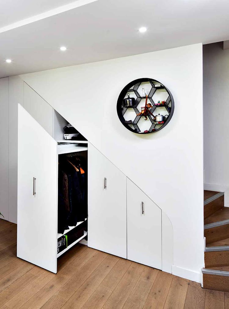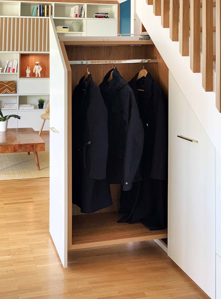 L’espace sous un escalier peut également être aménagé en dressing sur-mesure. Des étagères, des penderies sur coulisses et des tiroirs peuvent être installés pour ranger les vêtements, les chaussures ou tout autres accessoires. Cette solution est idéale pour les espaces réduits où il est difficile d’installer un dressing traditionnel.