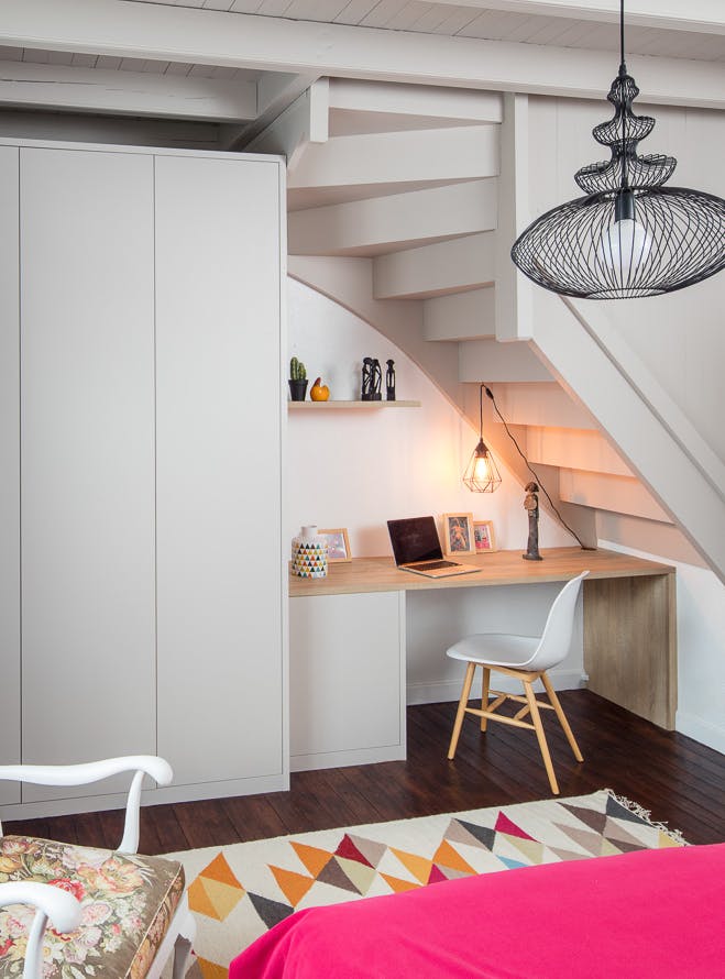 Si vous manquez d’espace pour créer un bureau dans votre maison ou appartement, l’espace sous l’escalier peut être une solution intéressante. Il est possible de créer un espace de travail confortable et pratique en installant un bureau sur mesure sous l’escalier. Si vous ne souhaitez pas garder le bureau accessible durant la journée, nous pouvons le dissimulé de façon discrète derrières des portes ouvrante. Des étagères ou des tiroirs peuvent également être ajoutés pour ranger du matériel de bureau.
