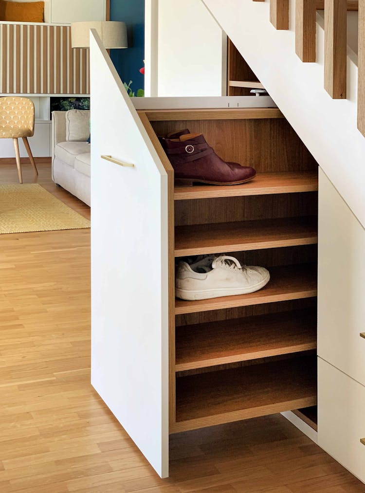 Les étagères sont un choix pratique pour maximiser l’espace sous un escalier. Elles sont conçues sur mesure pour s’adapter parfaitement à la configuration de votre escalier. En fonction de l’espace disponible, vous pouvez opter pour des étagères basses ou hautes afin combler l’espace. Il est également possible d’ajouter des portes et tiroirs coulissants pour cacher les étagères et créer une surface plane en guise de façade. Opter pour des ouvertures en touche lâche pour un rendu esthétiquement épuré ou ajouter-y des poignées élégantes pour dynamiser votre façade.