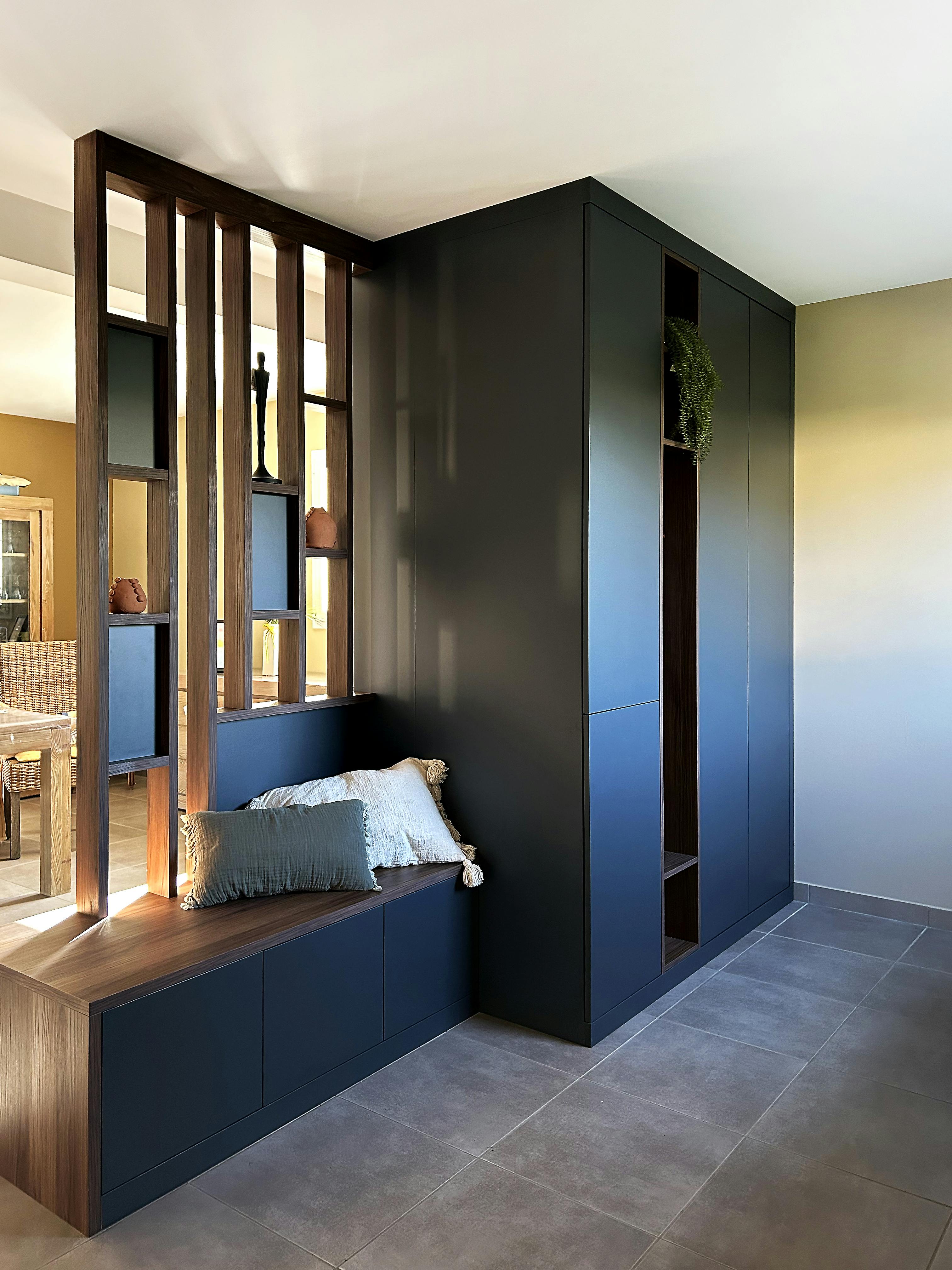 L’entrée est la première impression que l’on a d’une maison. Ici, l’objectif était double : créer du rangement pour toute la famille et proposer une zone conviviale pour accueillir les invités.