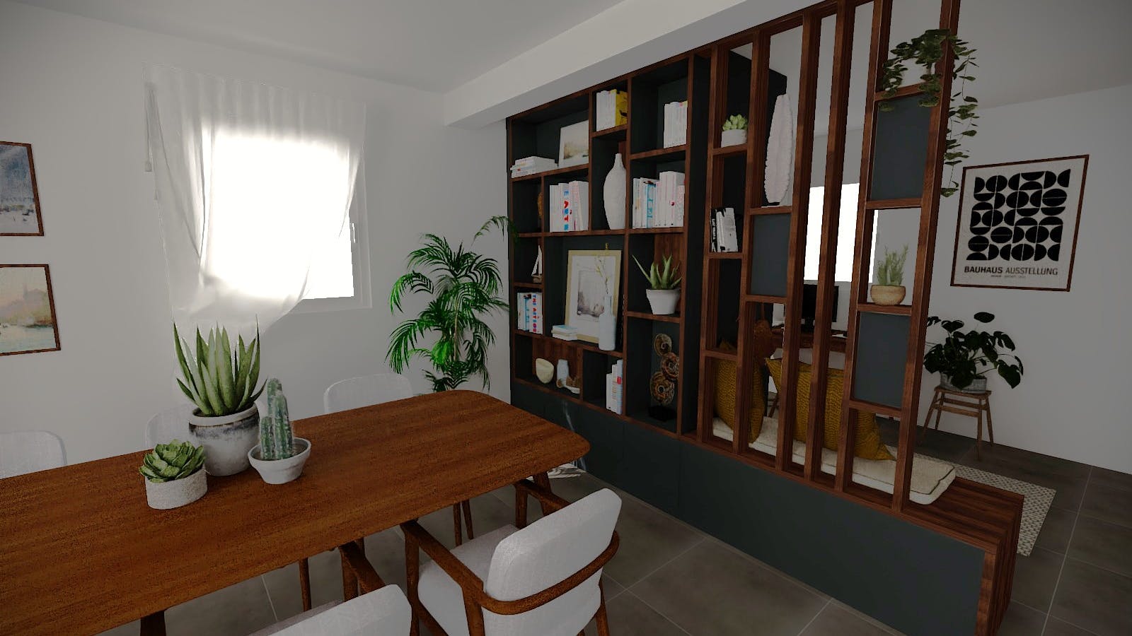 La vraie particularité de ce projet réside dans l’exploitation du verso du meuble. Plutôt que de se contenter d’un dos de placard, Marion a proposé à ses clients de prolonger la profondeur d’une vingtaine de centimètres. Résultat : une bibliothèque ouverte côté salle à manger.