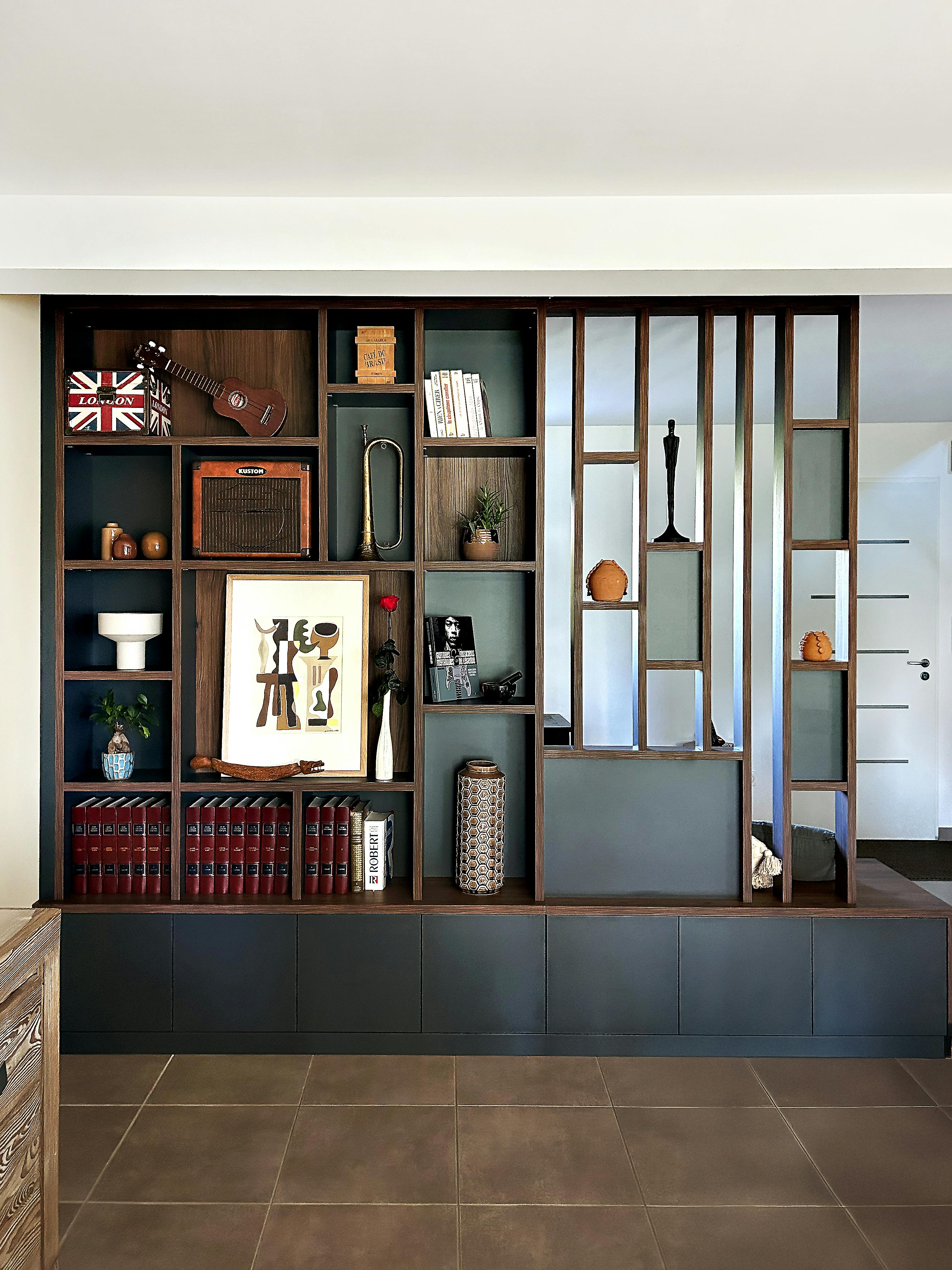 Un rythme de cases variées : certaines petites pour accueillir des objets décoratifs, d’autres plus grandes pour des livres et beaux ouvrages.