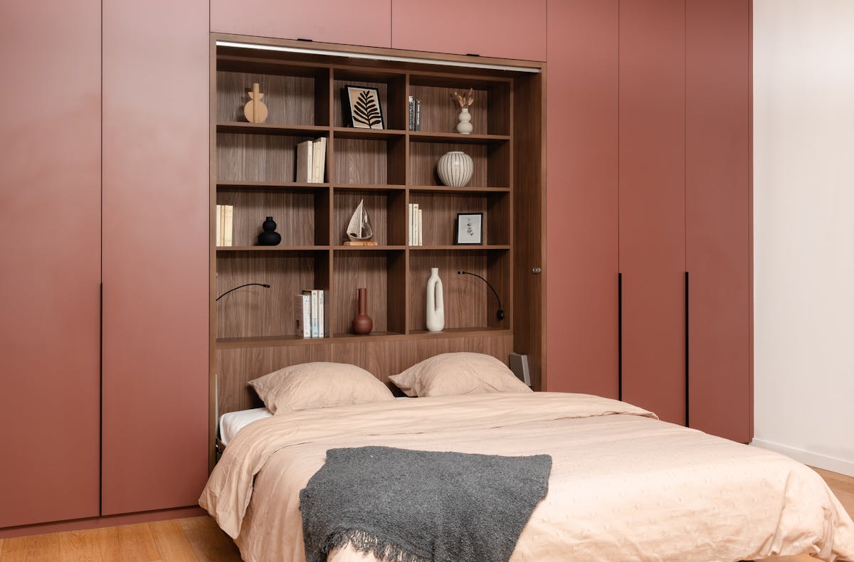 Un lit escamotable intégré dans une armoire sur mesure en est un excellent exemple : une seule intervention qui équilibre habitat, sommeil et circulation. Rien de fortuit, mais le résultat d’une vision, d’une expérience et d’une grande précision. C’est toute la valeur ajoutée du travail d’un architecte d’intérieur.