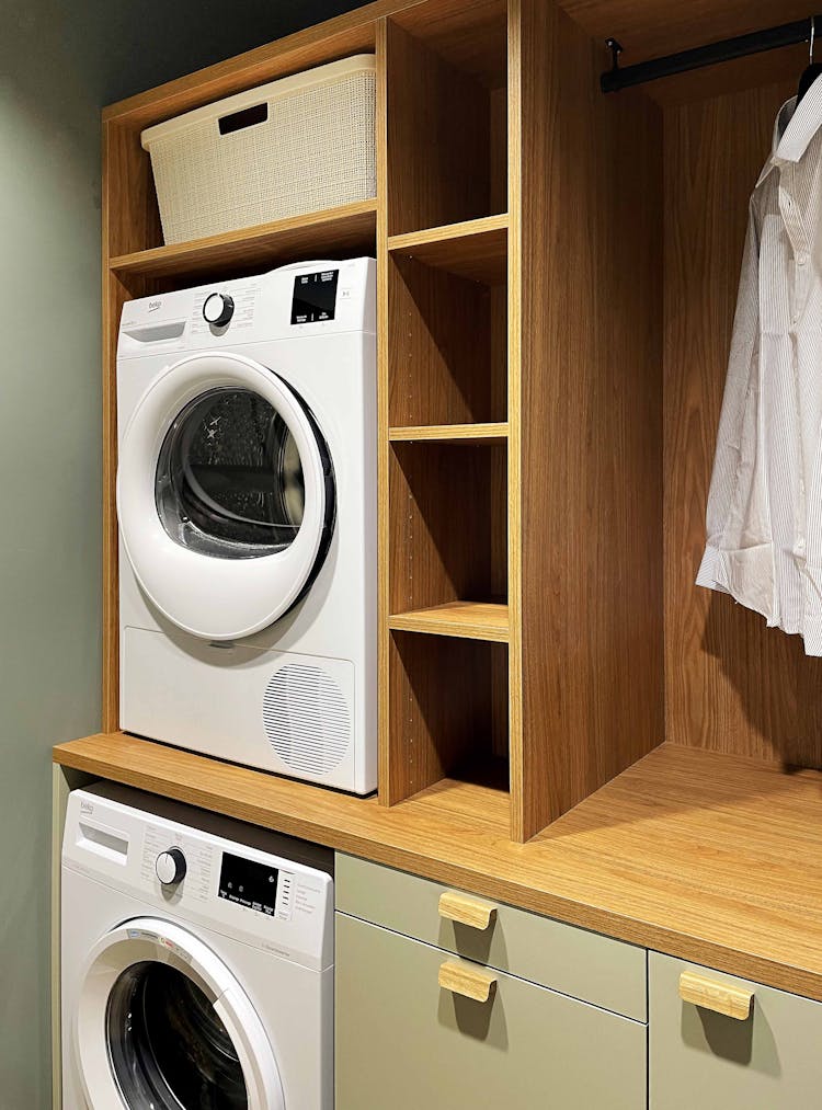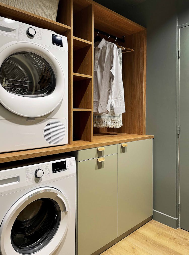 Le plan de travail en bois clair, chaleureux et durable, permet de plier le linge ou d’y poser des objets d’usage quotidien. Il contraste joliment avec les rangements aux portes vertes, créant une esthétique moderne et apaisante. Les poignées en bois sculpté ajoutent une touche d’élégance naturelle, s’harmonisant parfaitement avec le reste du mobilier.