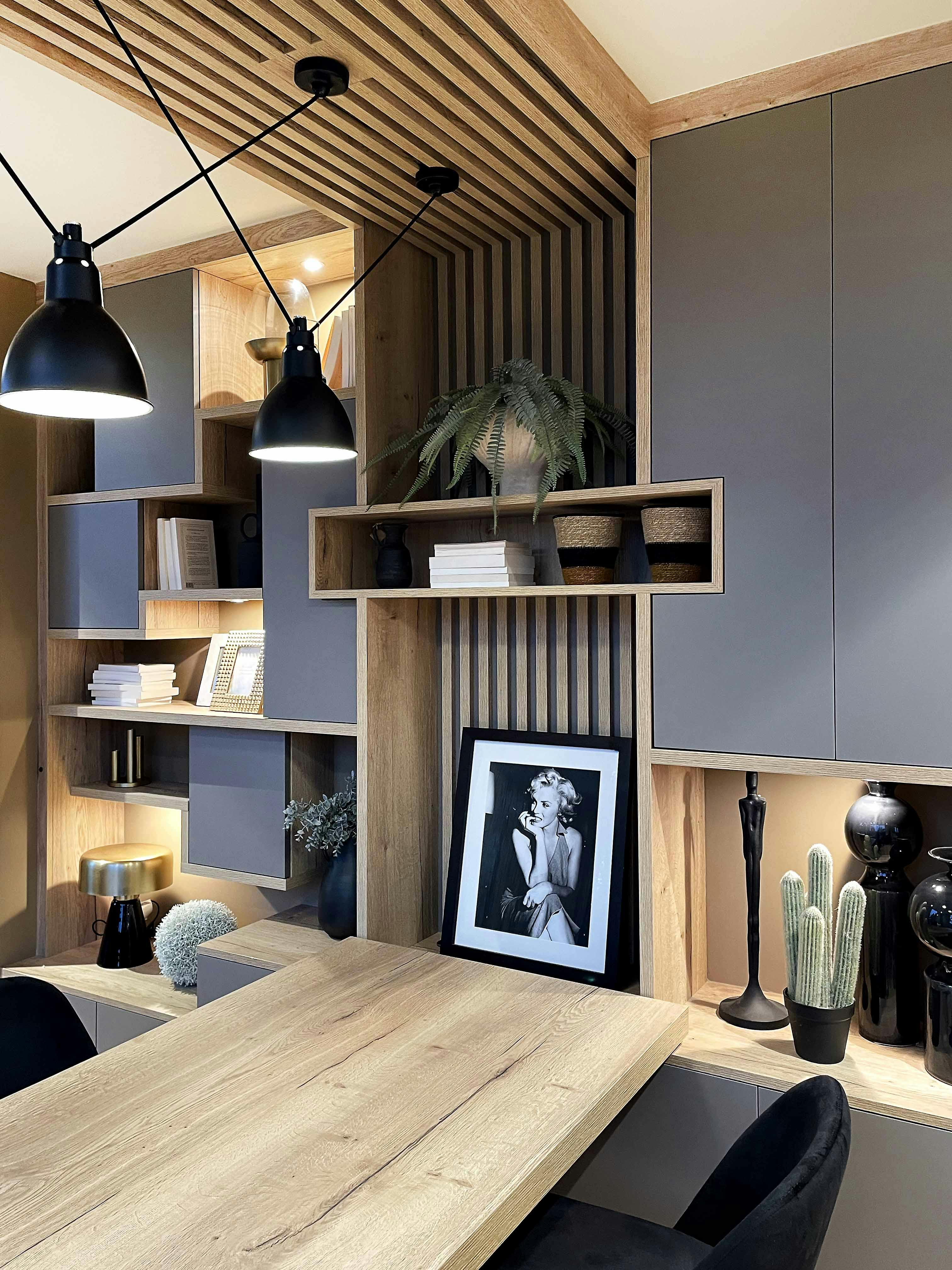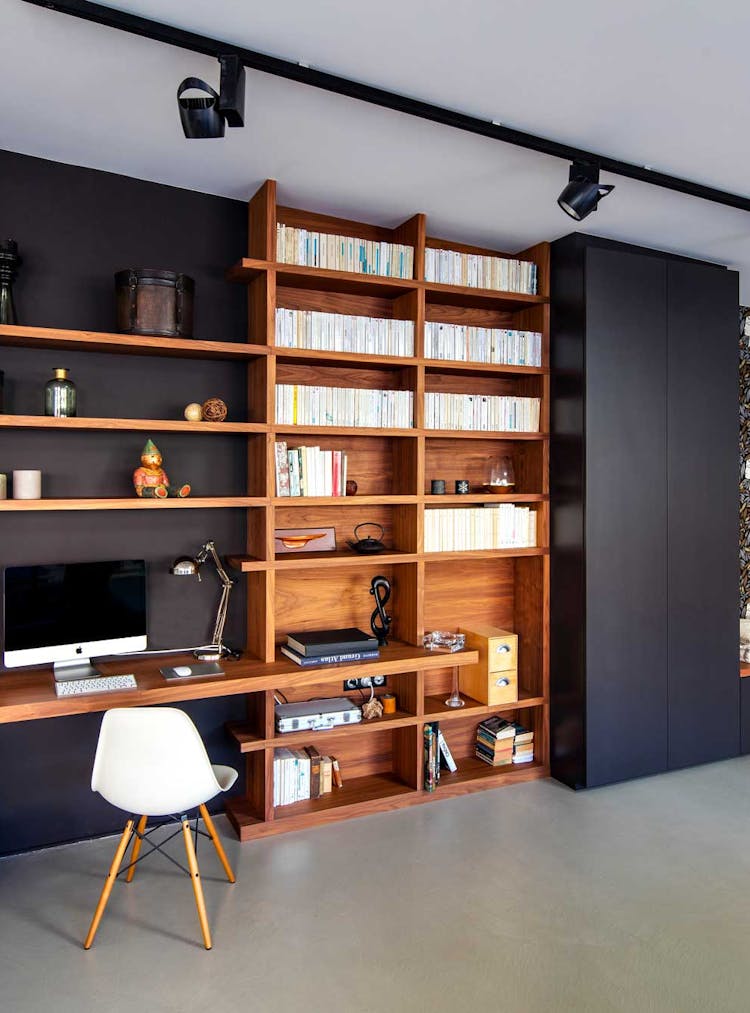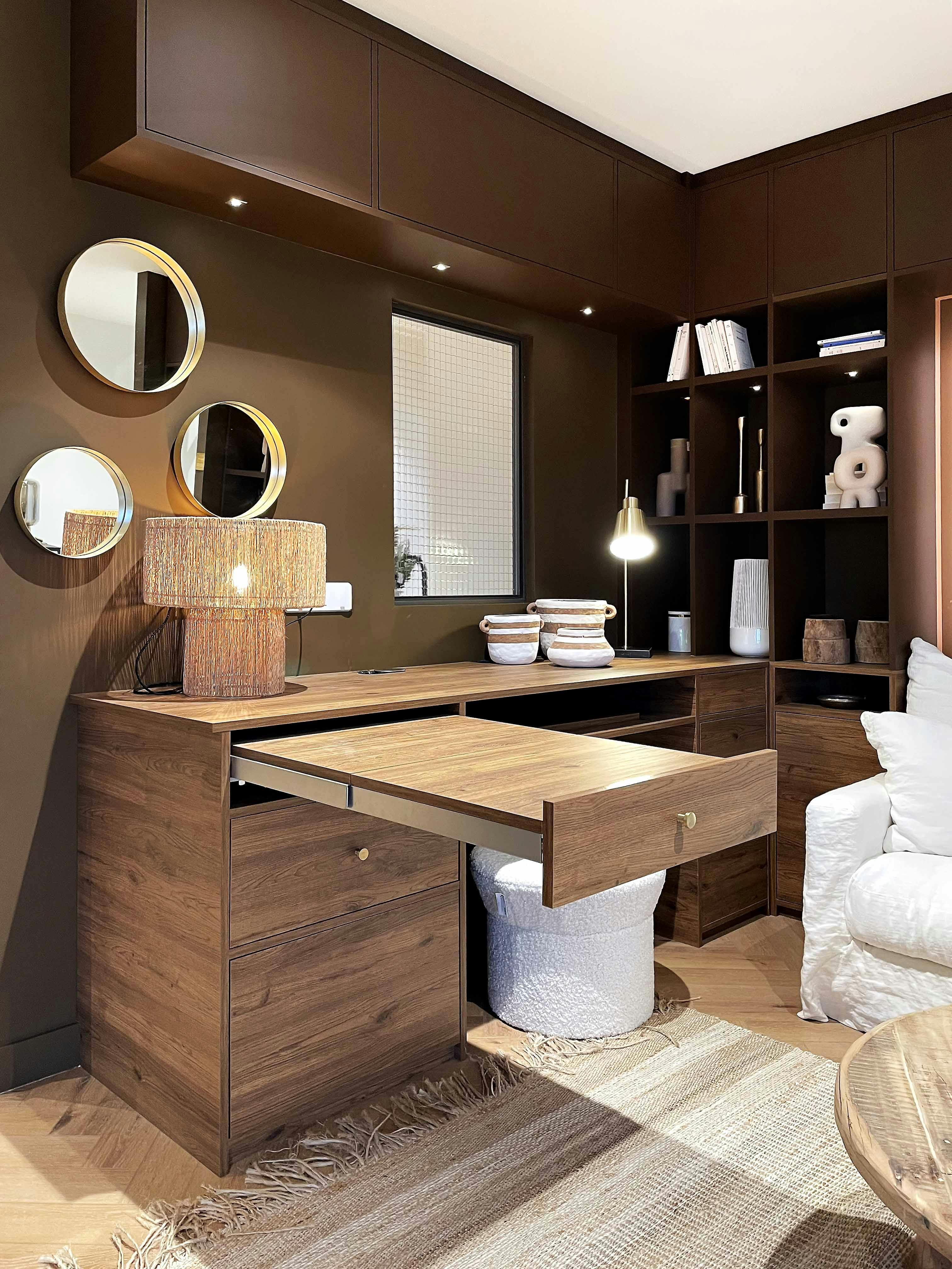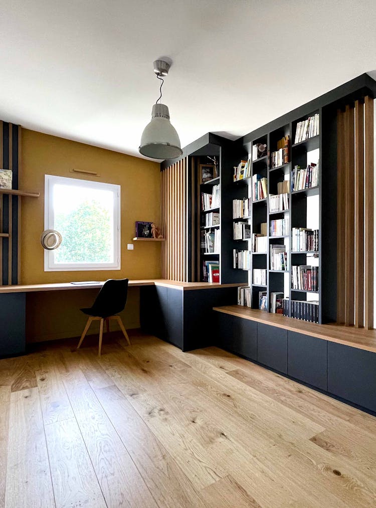 - Bureau intégré dans une bibliothèque : associez un bureau sur-mesure à une bibliothèque dans le salon pour un espace multifonctionnel, alliant rangement et surface de travail.