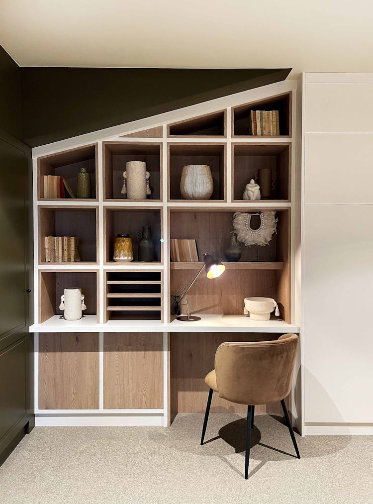 - Bureau sous escalier : un emplacement souvent délaissé, mais idéal pour un bureau compact et discret. Un bureau sur-mesure sous-escalier optimise l’espace et offre des rangements intégrés.