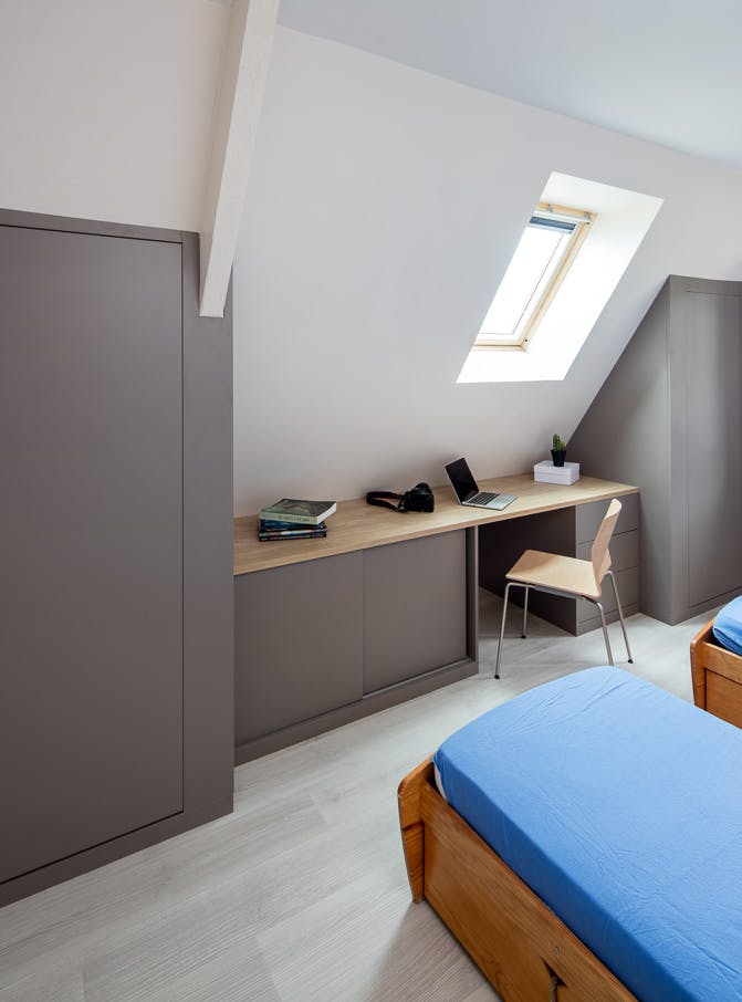 - Bureau sous-combles ou sous-pente : dans une pièce réduite, un bureau sous-combles maximise l’espace sous les pentes et offre un plan de travail pratique.