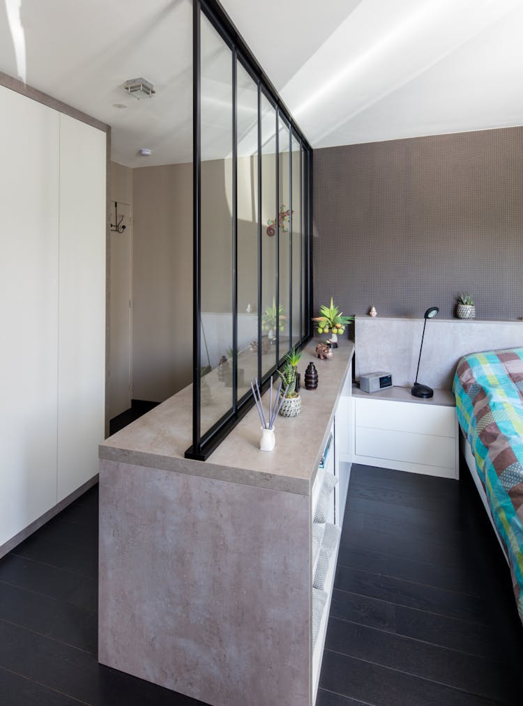 Dans la chambre, une verrière apporte du charme et de la structure, notamment pour délimiter des espaces tels qu’un coin dressing ou une salle de bain privative. En optant pour une verrière porte ou des meubles de sous-bassement, il est possible de combiner esthétique et praticité, en optimisant l’espace tout en préservant une certaine intimité. Une verrière en verre dépoli, par exemple, peut ajouter de l’intimité tout en laissant passer la lumière.