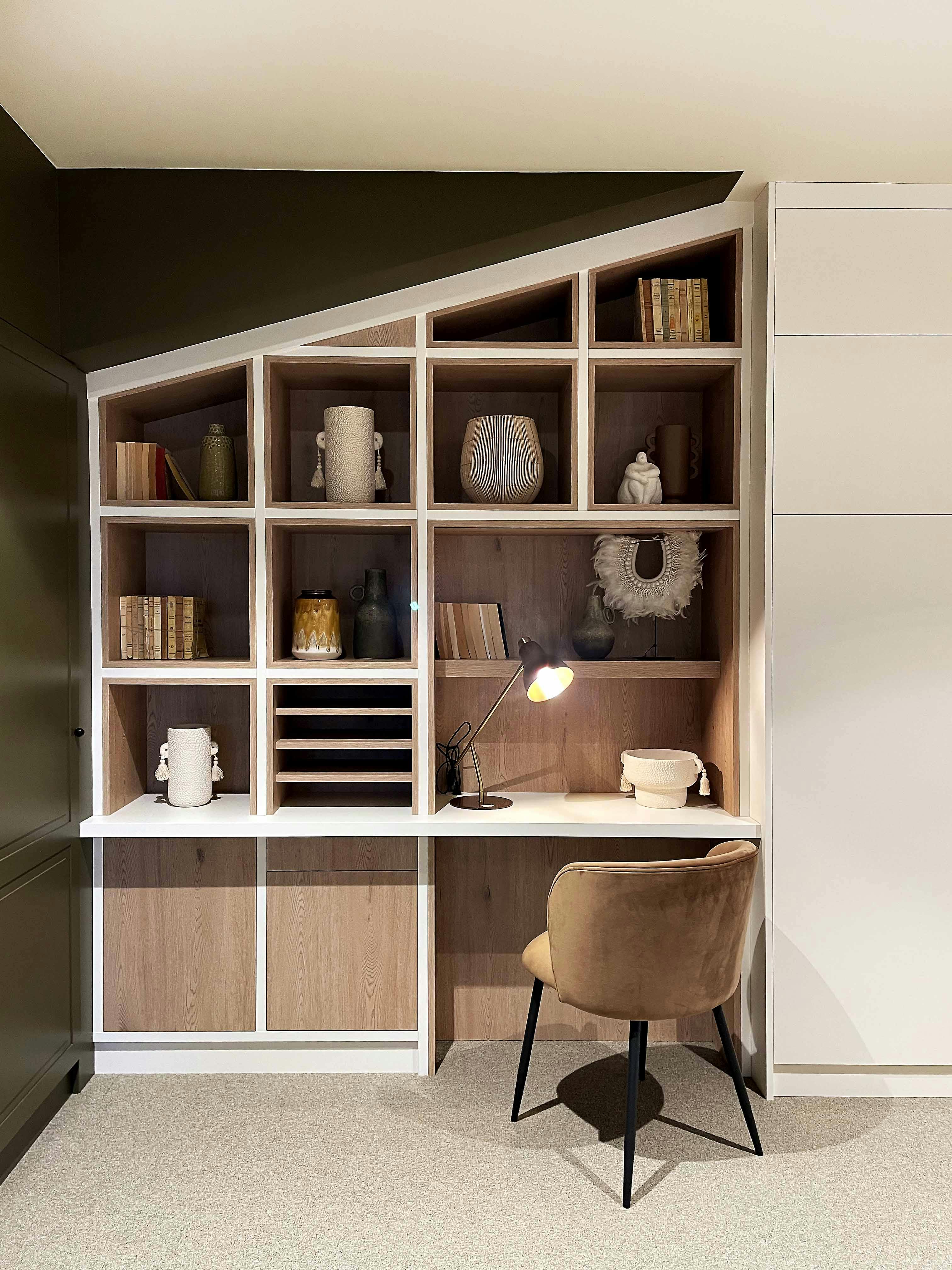 Un espace inexploité peut devenir un véritable coin bureau. Le sur-mesure permet d’exploiter chaque centimètre, même dans des configurations atypiques. Résultat : un bureau naturellement délimité, sans cloisonner la pièce.