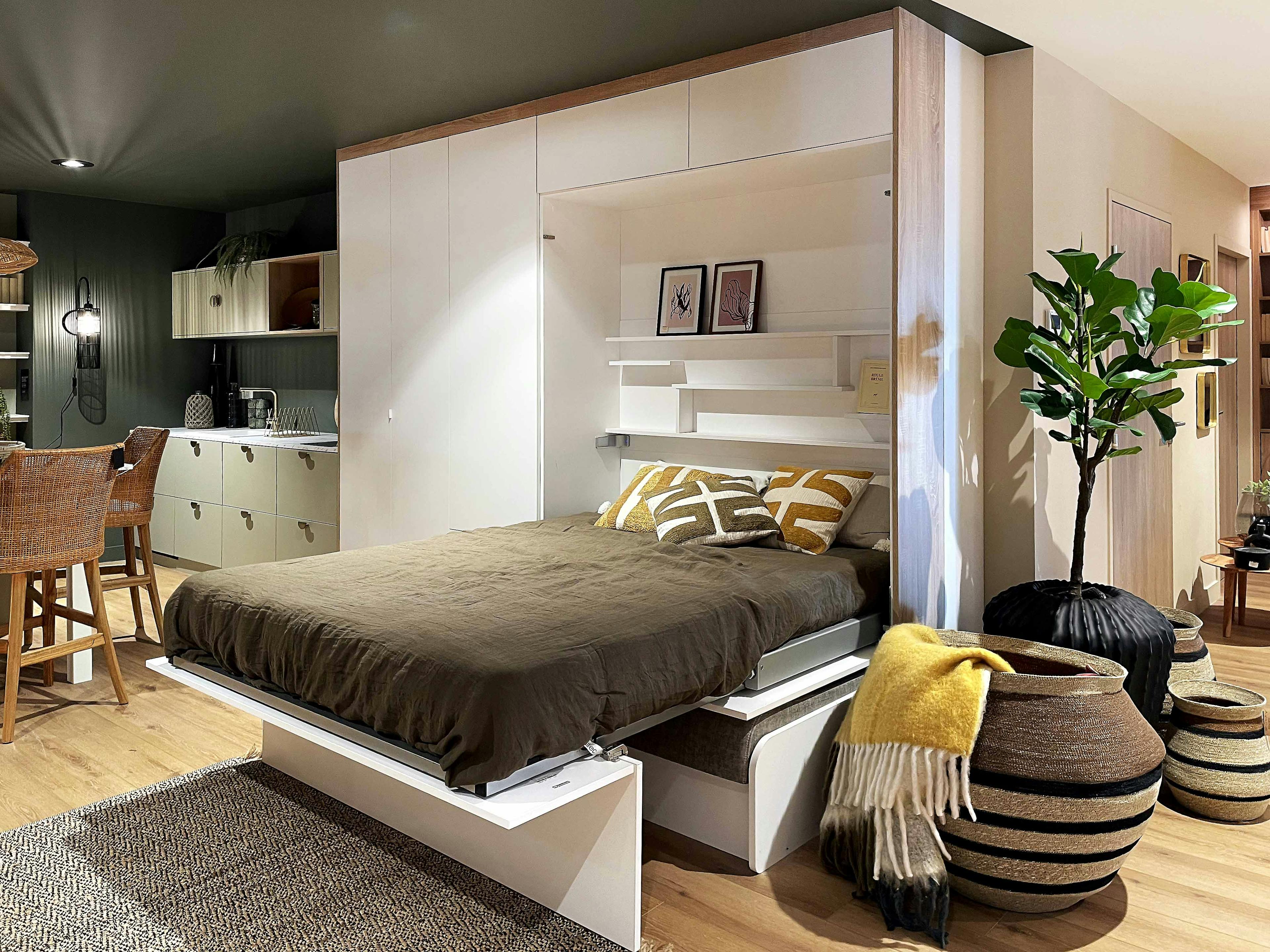 Le lit pont est un aménagement très apprécié pour les chambres où l’espace est limité ou lorsqu’on souhaite créer un mur de rangement harmonieux autour du lit. Ajouter un chevet intégré directement dans la structure rend l’ensemble encore plus fonctionnel.