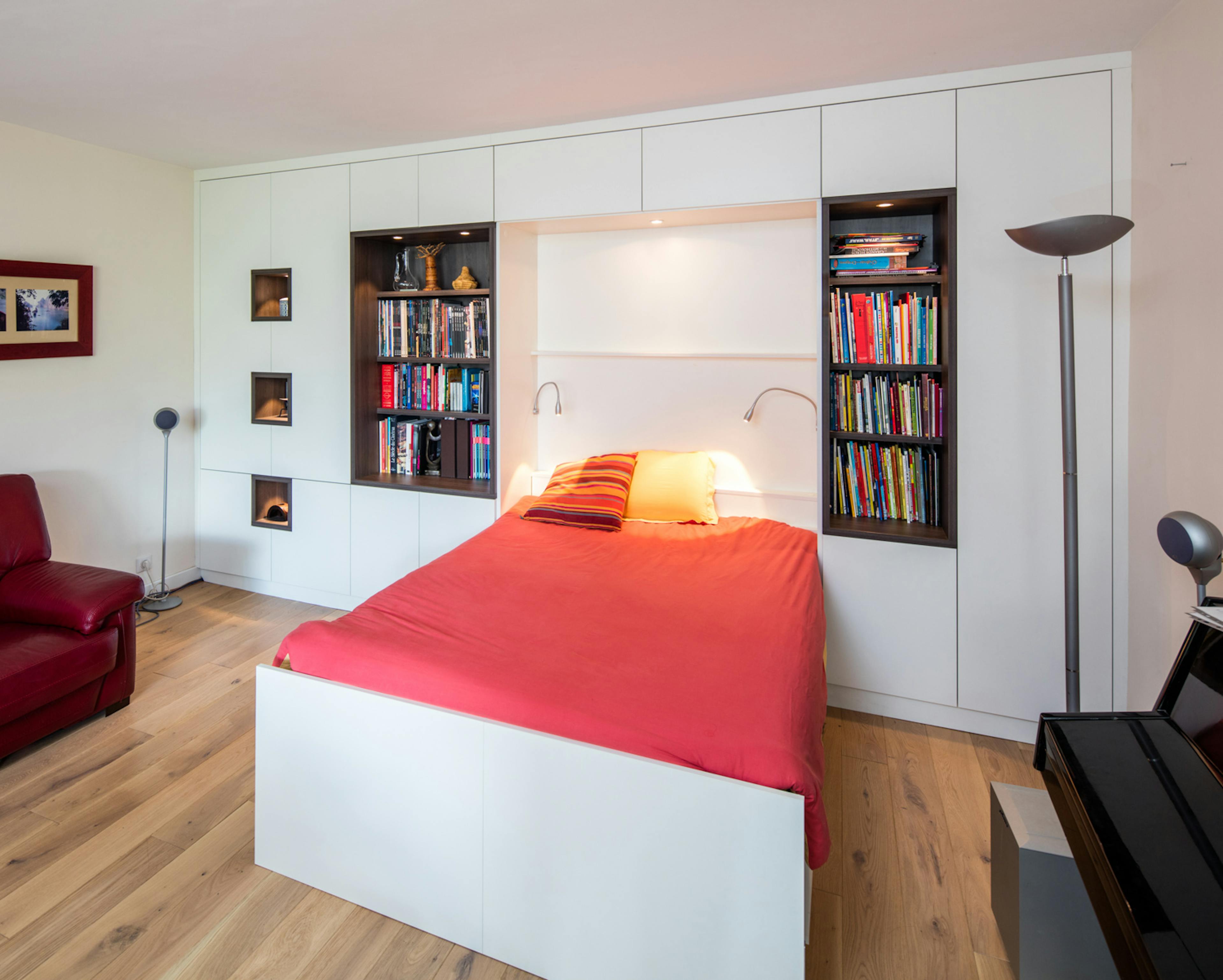 Concevoir un meuble de chevet intégré dans un lit pont est une solution idéale pour optimiser l'espace d’une chambre et créer un ensemble à la fois élégant, pratique et parfaitement adapté à votre quotidien. Grâce au sur-mesure, nos architectes d’intérieur et nos menuisiers agenceurs imaginent un chevet totalement personnalisé : dimensions, matériaux, rangements, éclairage, prises… tout est pensé pour s’intégrer naturellement dans votre pièce.