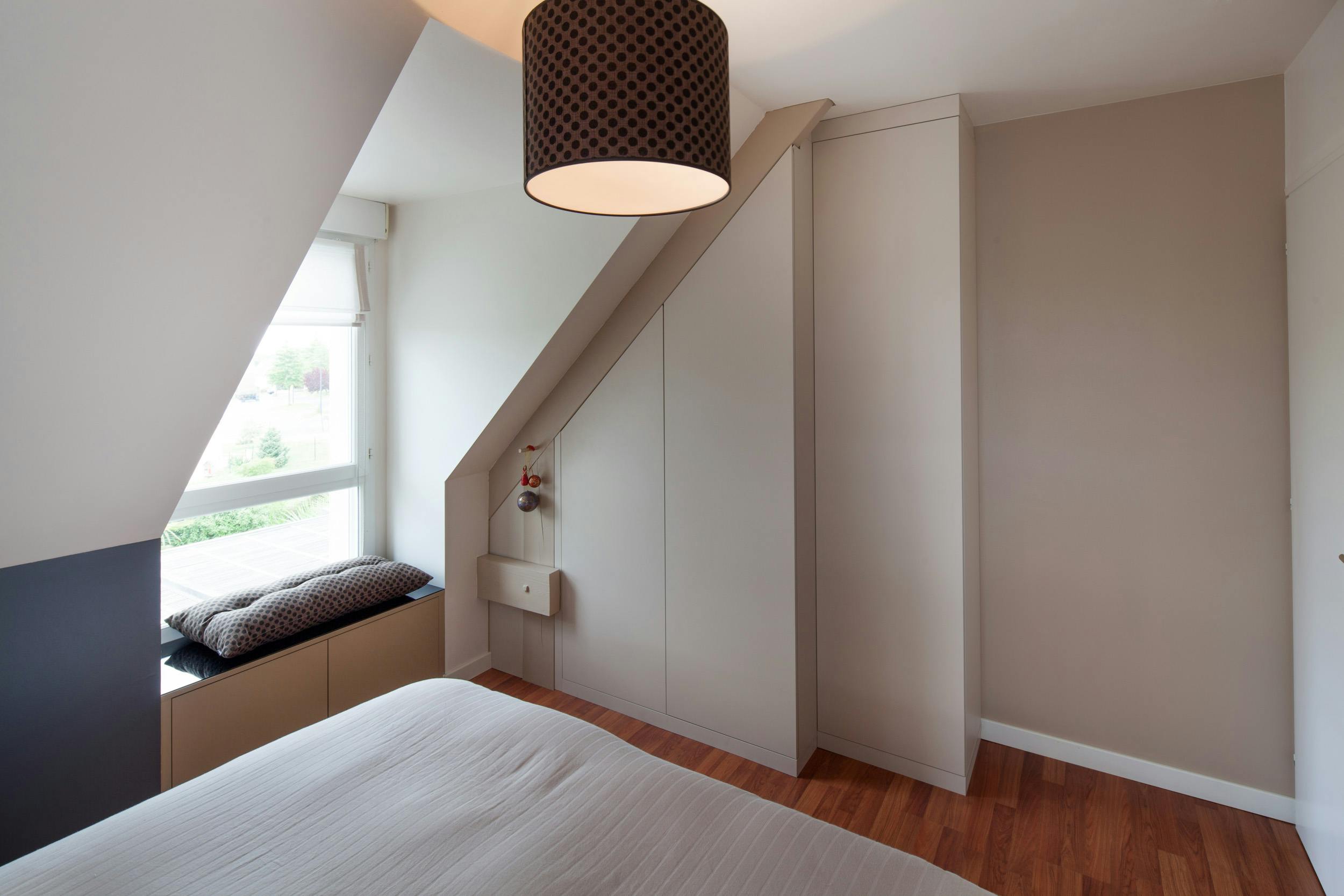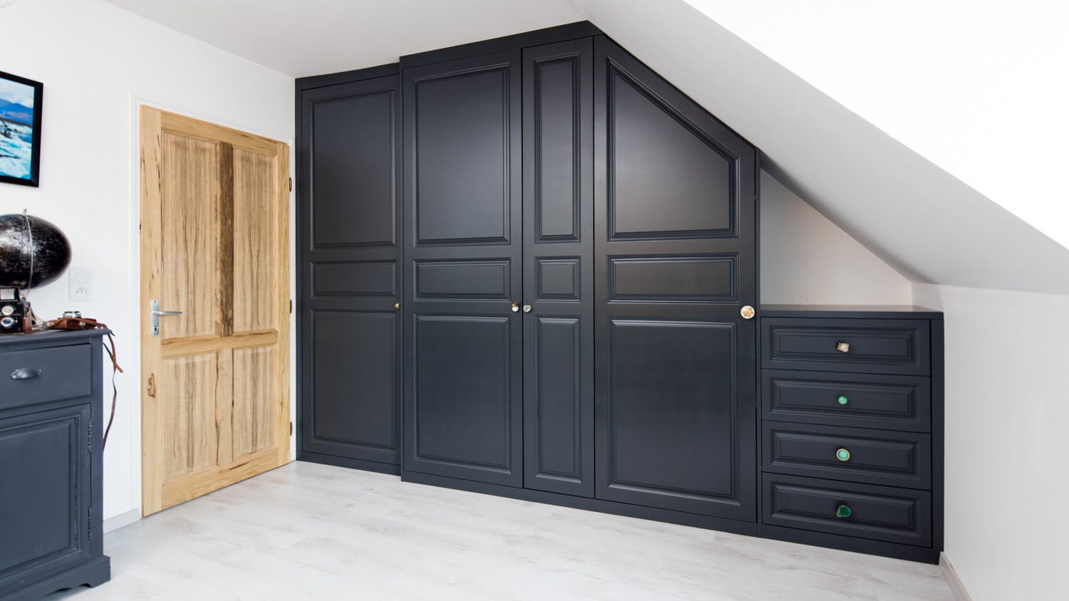 - L’avantage du sur-mesure, c’est qu’il occupera l’espace en entier, permettant alors de ranger un maximum d’affaires. Il existe également une situation fréquente qui rend l’utilisation de l’espace plus compliquée : la pente. Qu’il s’agisse d’un dessous d’escalier ou sous les combles, il arrive parfois que la pente soit importante et ne permet pas une utilisation optimale de la pièce. De ce fait, pourquoi ne pas en profiter pour installer un meuble sur-mesure sous pente ?