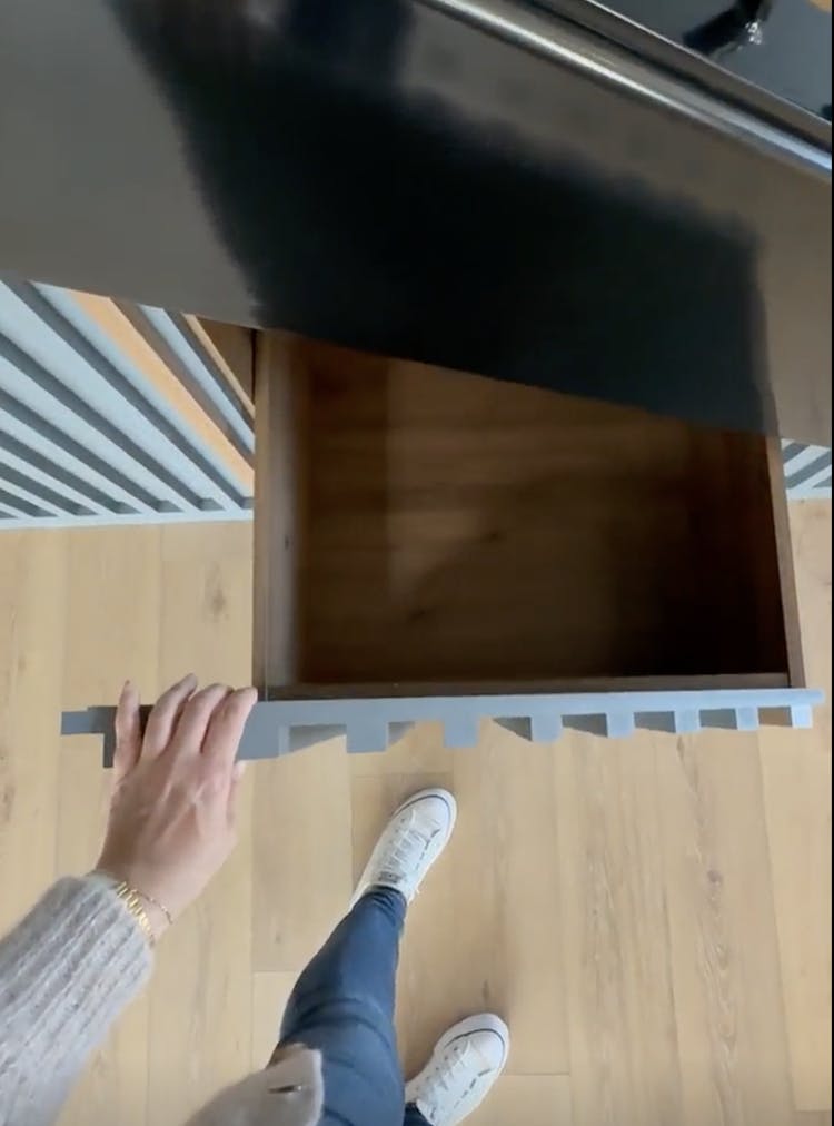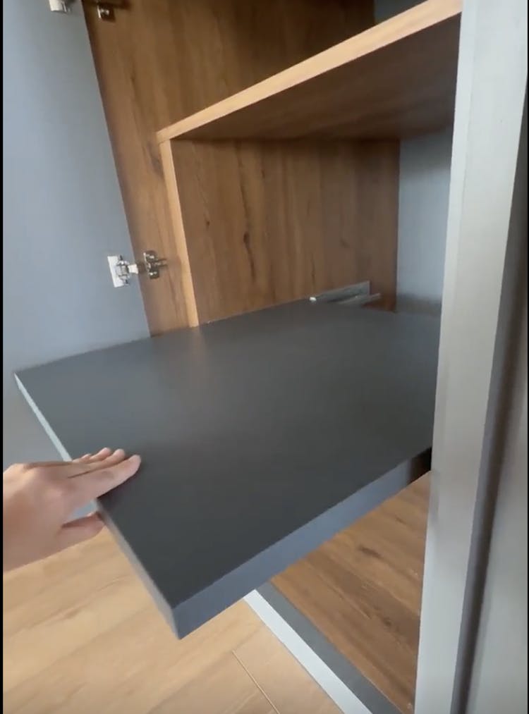 « L’espace était très profond, inutilisé jusque-là. Nous avons installé des tiroirs, des tablettes, tout un ensemble coulissant pour maximiser le rangement. Les clients étaient ravis : ils ont pu y ranger tout ce qu’ils utilisaient ponctuellement. »