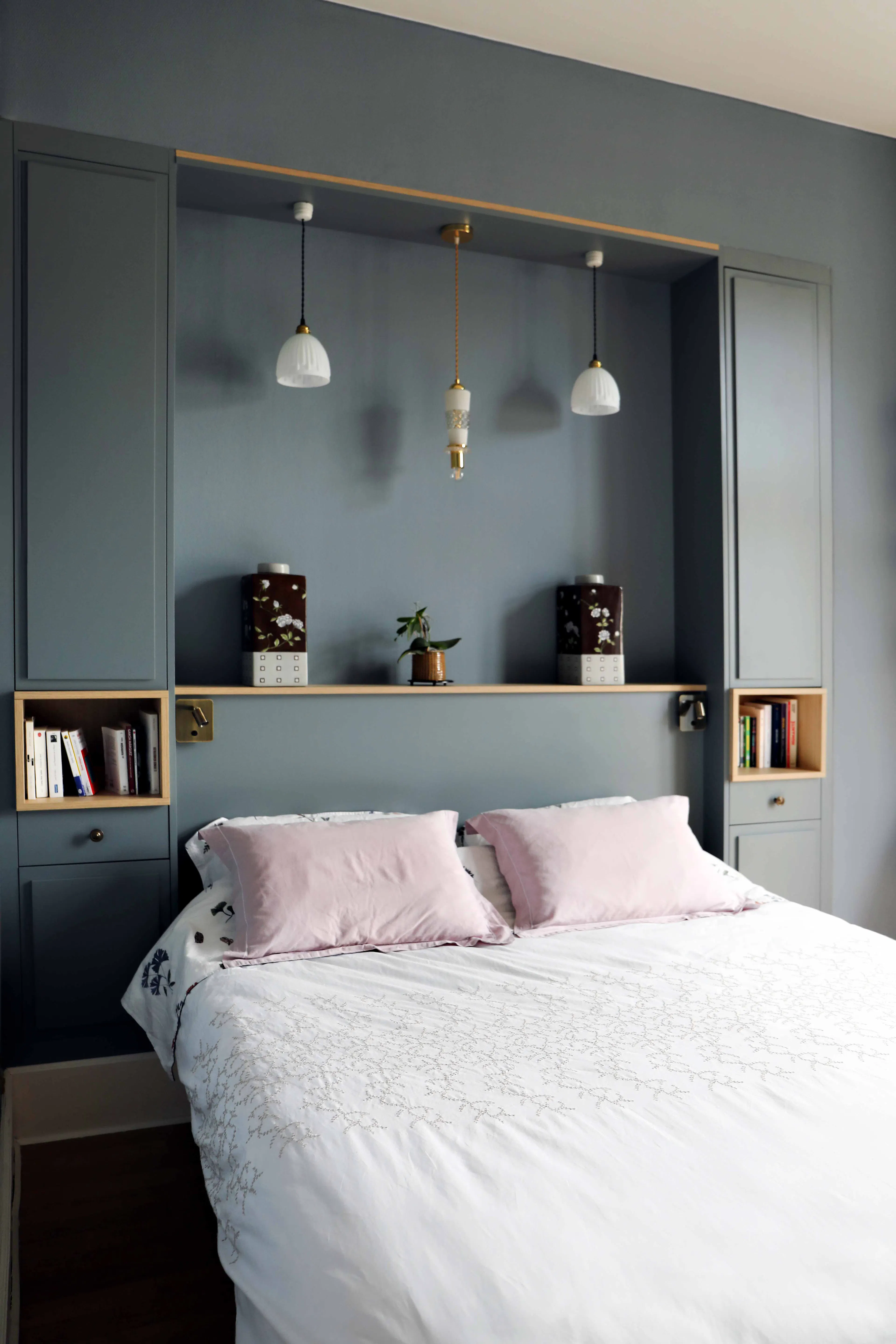 Cette configuration permet d’utiliser des zones souvent laissées vides, notamment au-dessus du lit. L’ensemble crée une structure harmonieuse qui donne du caractère à la chambre tout en apportant une vraie solution de rangement.
