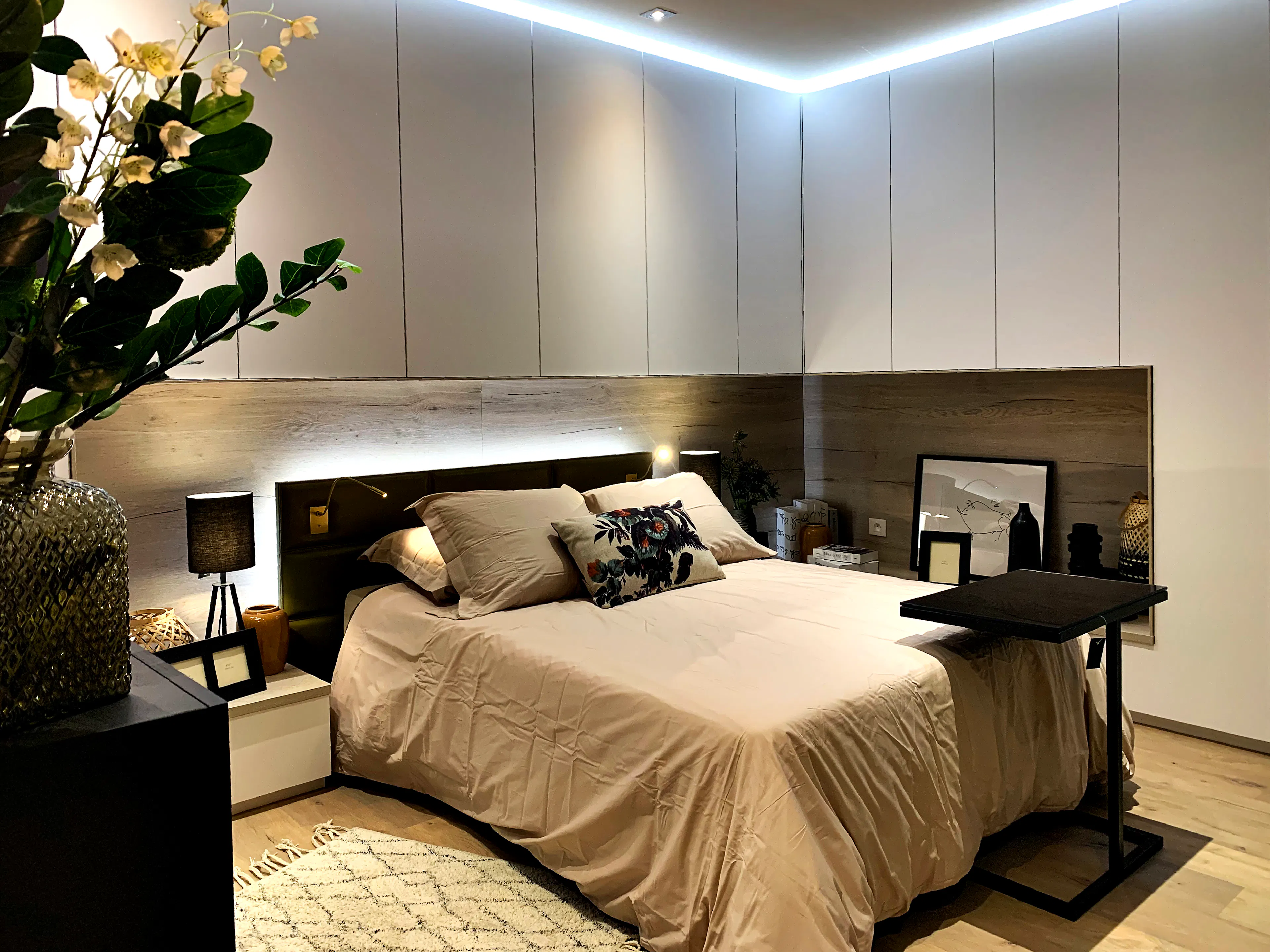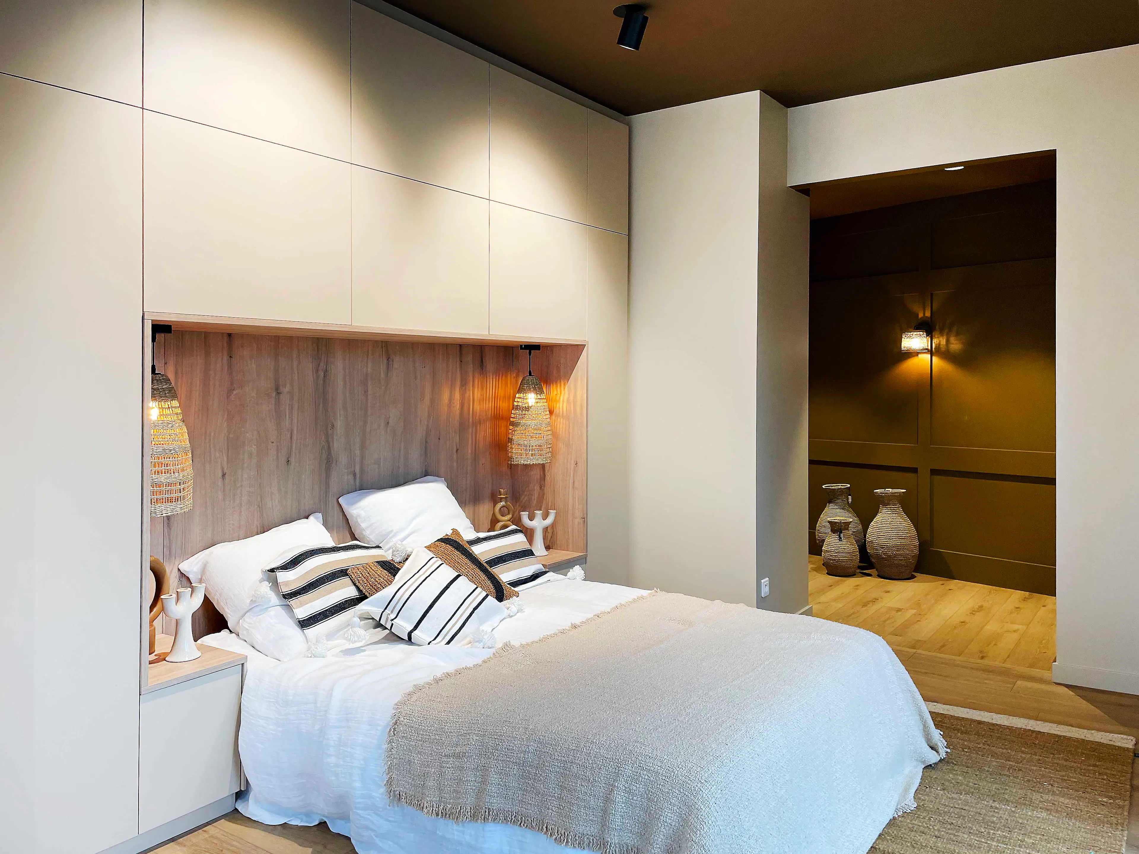 - Les détails font aussi toute la différence. Il est envisageable d’intégrer un éclairage discret au-dessus du lit, des poignées invisibles pour un rendu épuré, ou encore des niches ouvertes pour apporter du rythme à l’ensemble.