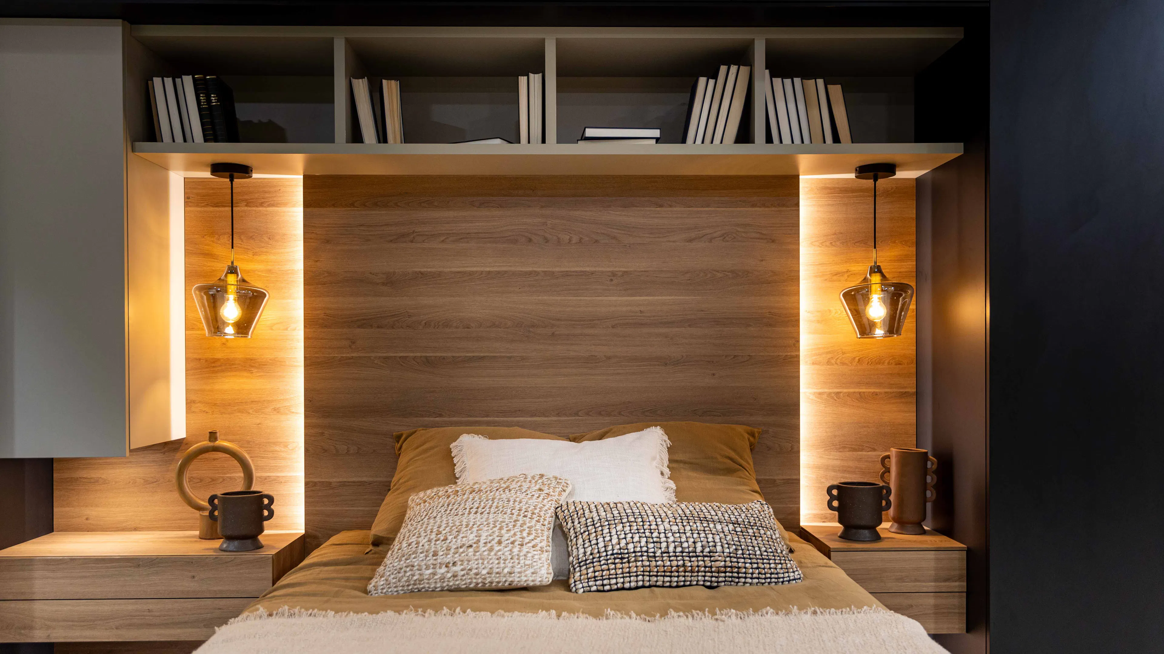 Le lit pont est un aménagement intégré qui vient encadrer le lit pour exploiter toute la hauteur et la largeur du mur. Il se compose généralement d’un couchage central, entouré de rangements latéraux et surmonté de meubles en hauteur qui forment un “pont”.