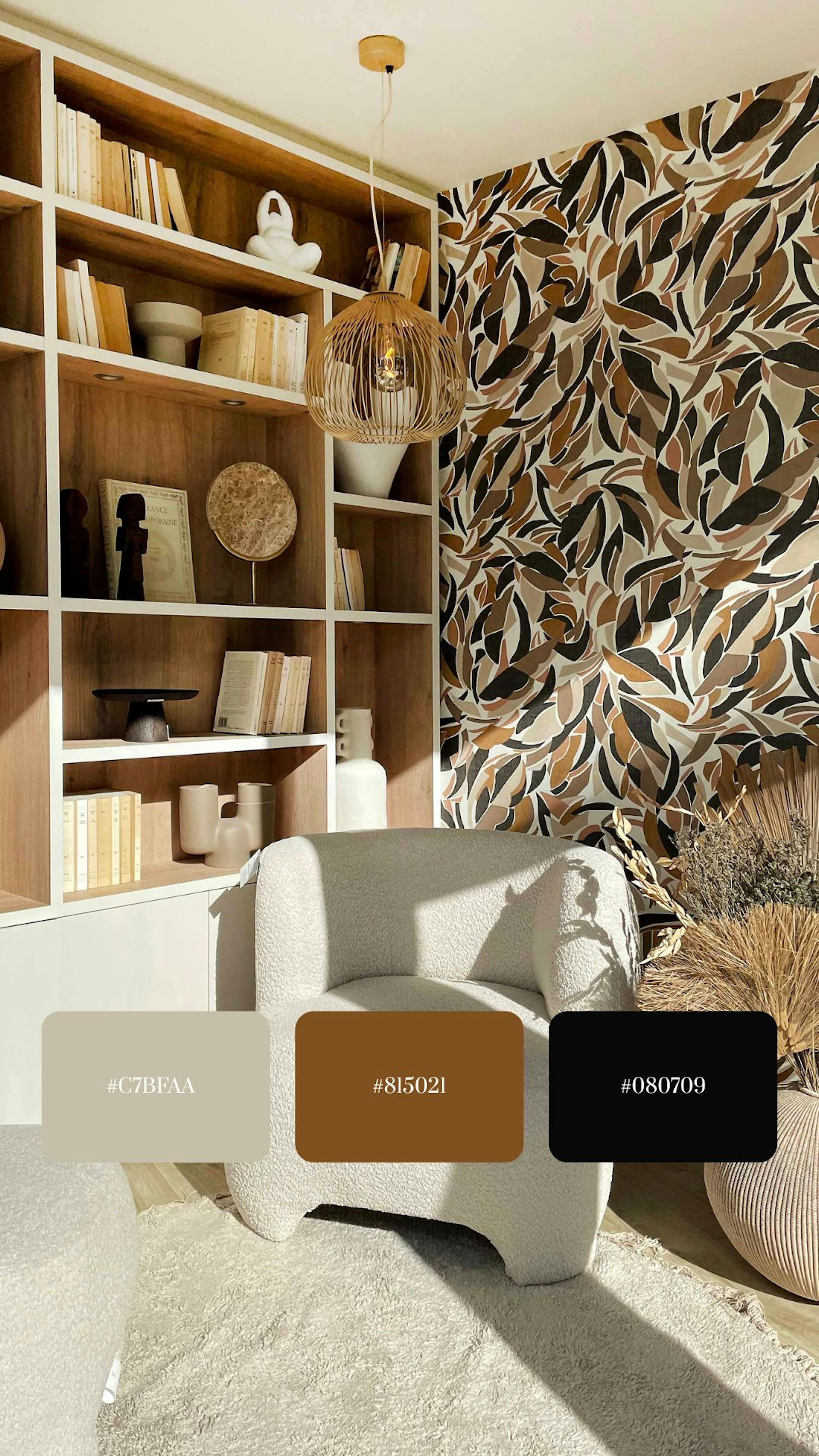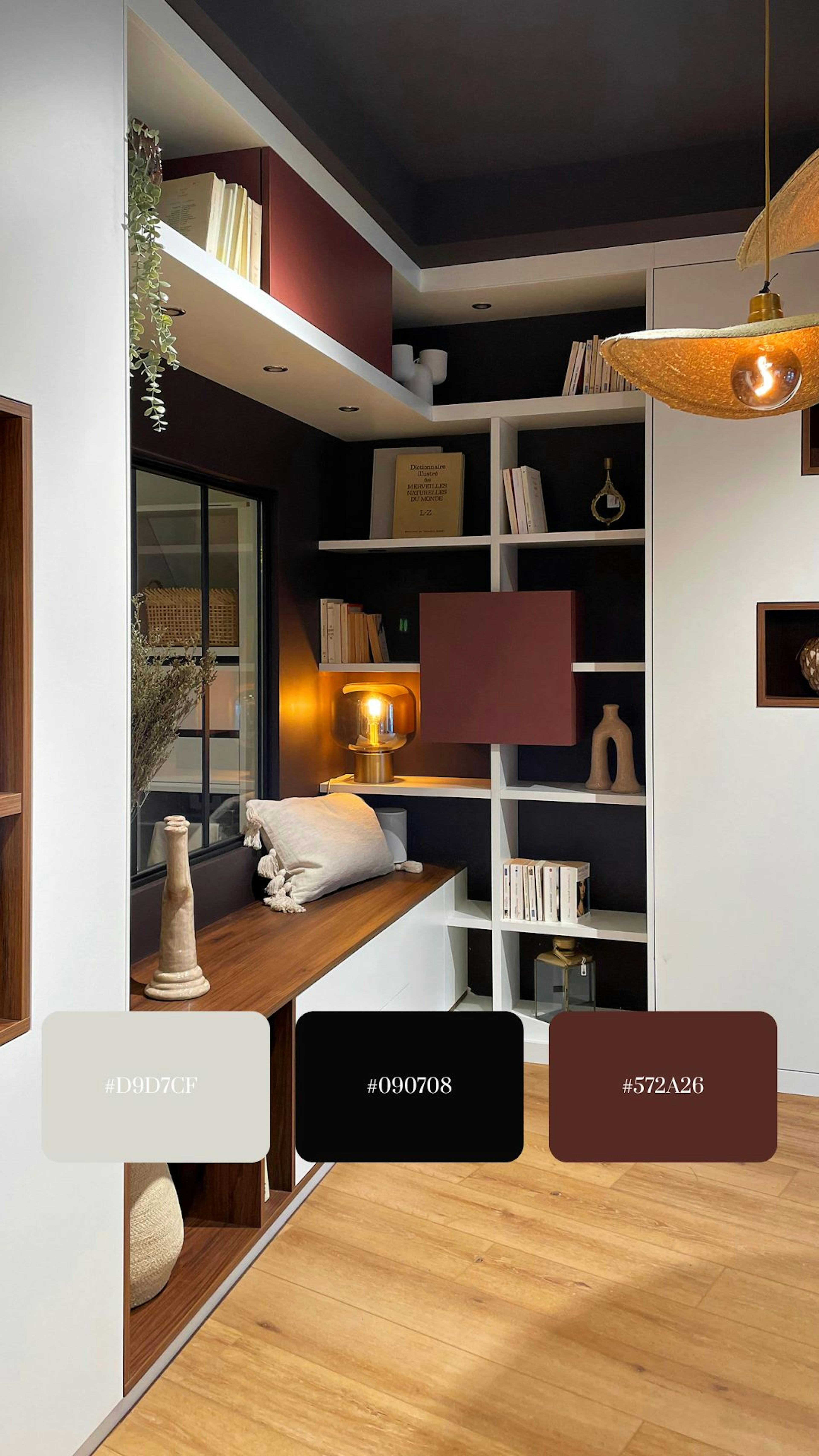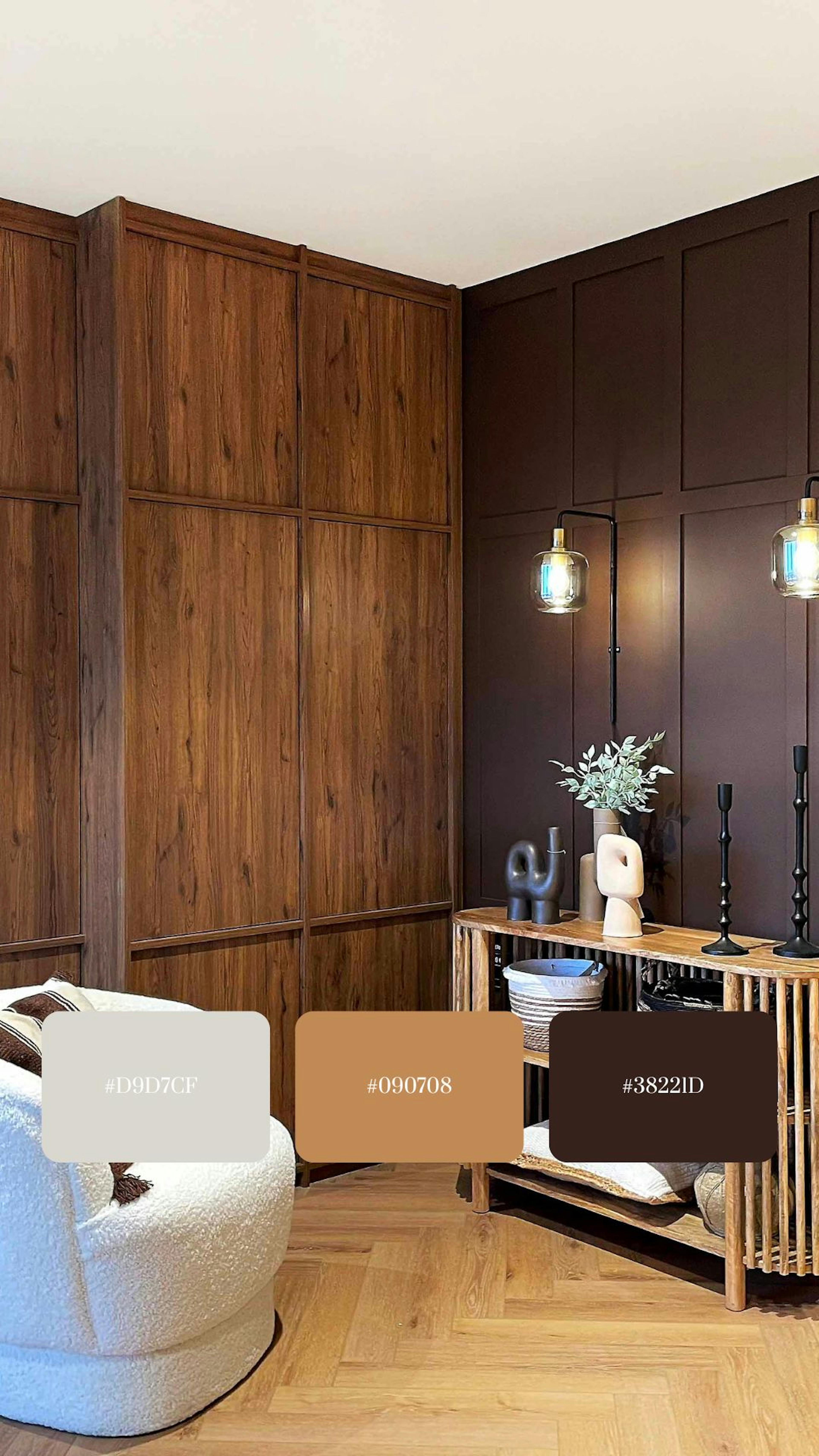 Parfaite pour un salon ou un bureau, cette palette associe le contraste du noir profond et la chaleur du noyer. Le beige clair adoucit l’ensemble et met en valeur les lignes des meubles.