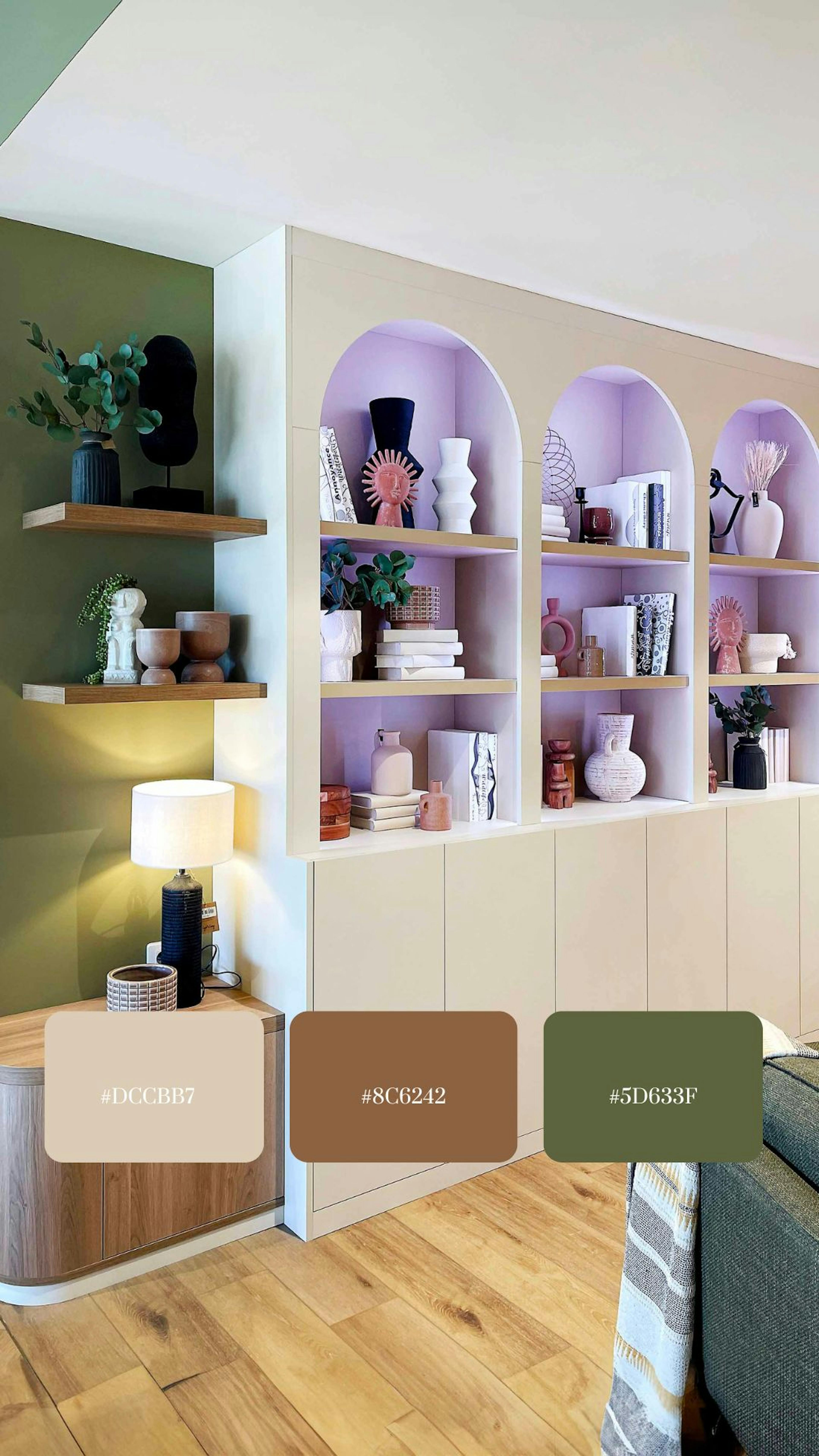 Cette combinaison de tons chauds et feutrés trouve parfaitement sa place dans un salon ou un espace TV. Le vert apporte une touche sophistiquée, la terracotta réchauffe, et les nuances miel équilibrent l’ensemble.