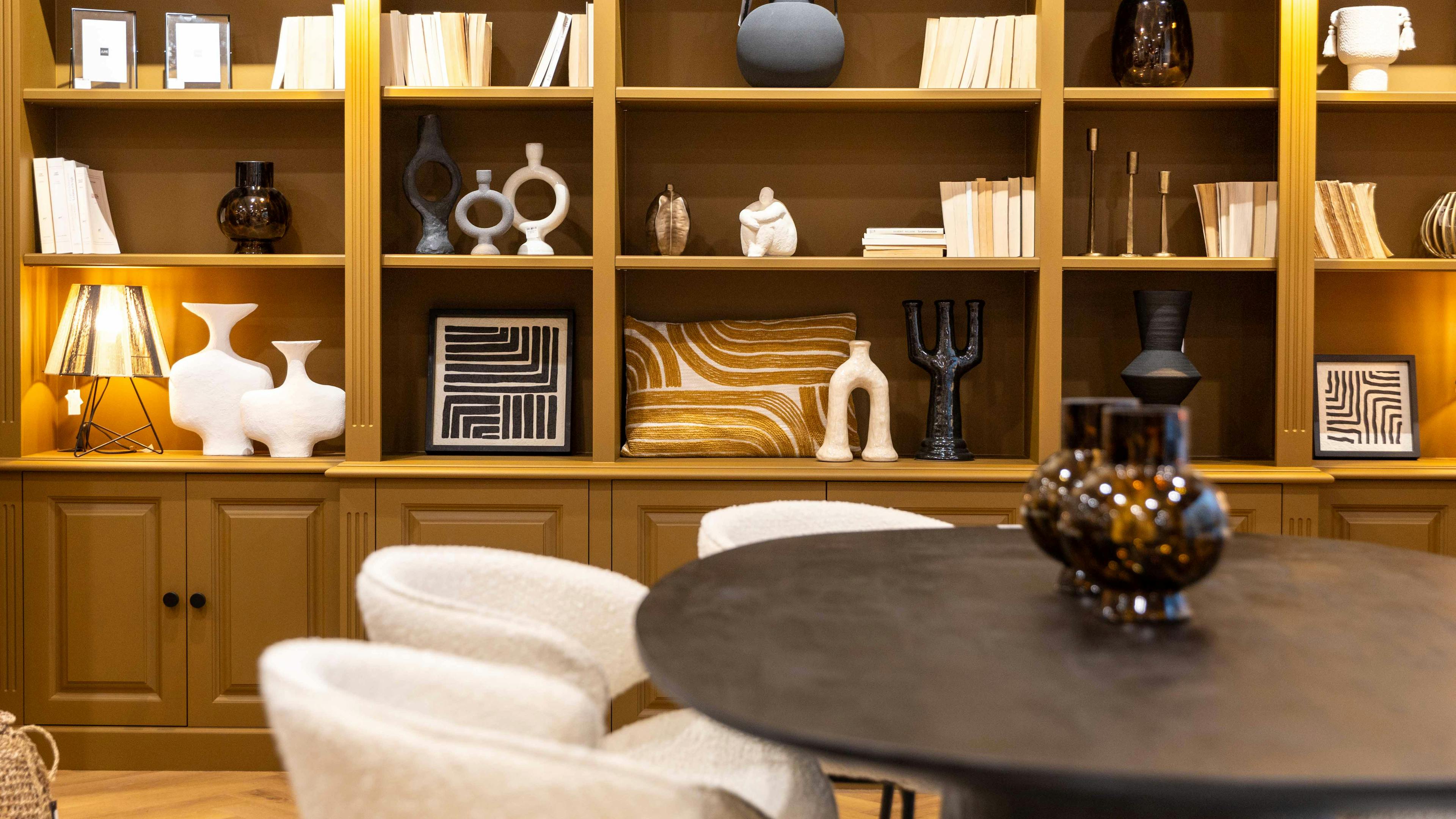 Nos architectes d’intérieur recommandent ce trio pour les aménagements intégrant une bibliothèque murale ou un coin lecture. Les zones sombres structurent l’espace, tandis que les surfaces claires reflètent la lumière et agrandissent la pièce.