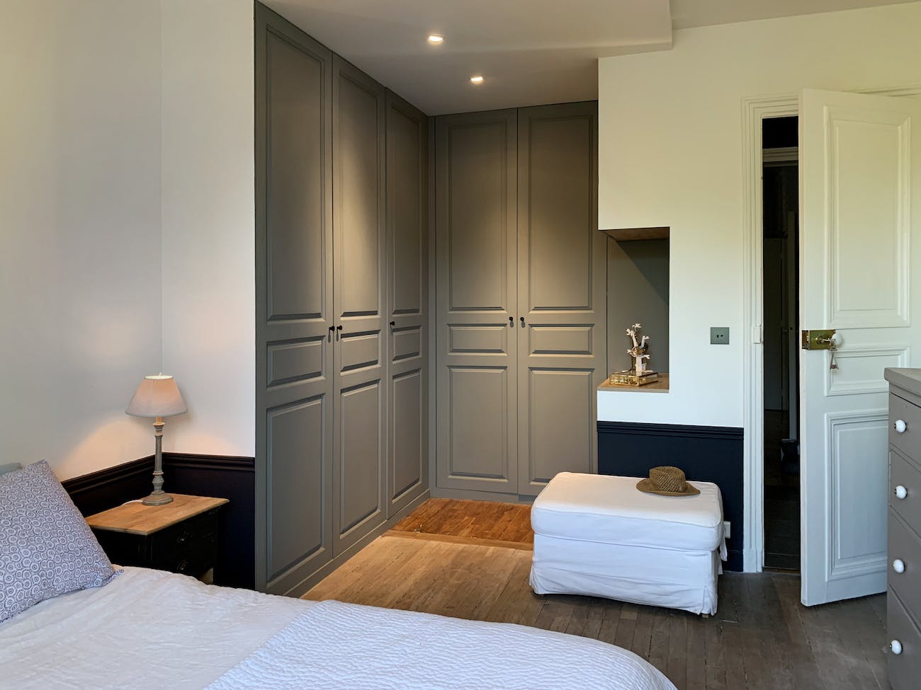 - Possibilité d’intégrer des penderies pivotantes, des étagères modulables ou des tiroirs d’angle.