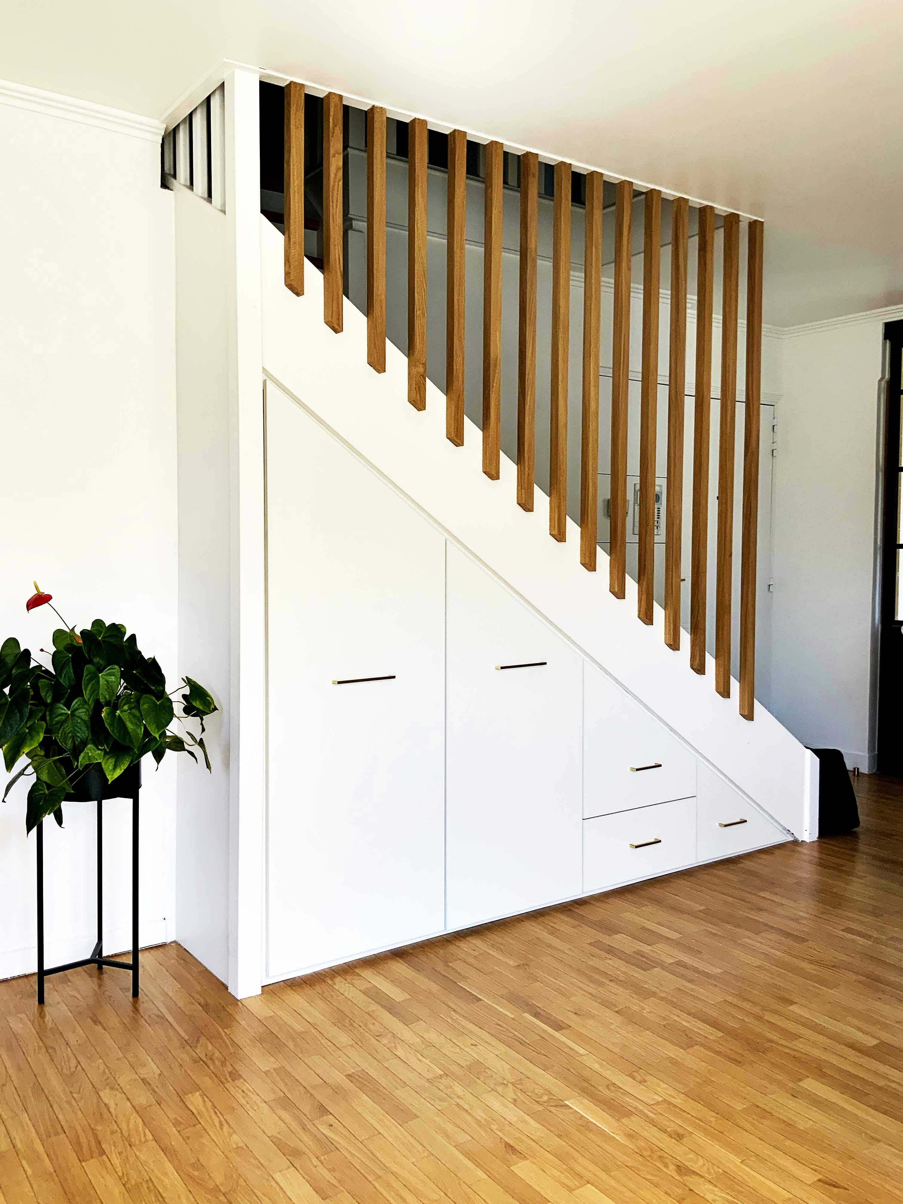 Sous-escalier blanc avec grands placards de rangement