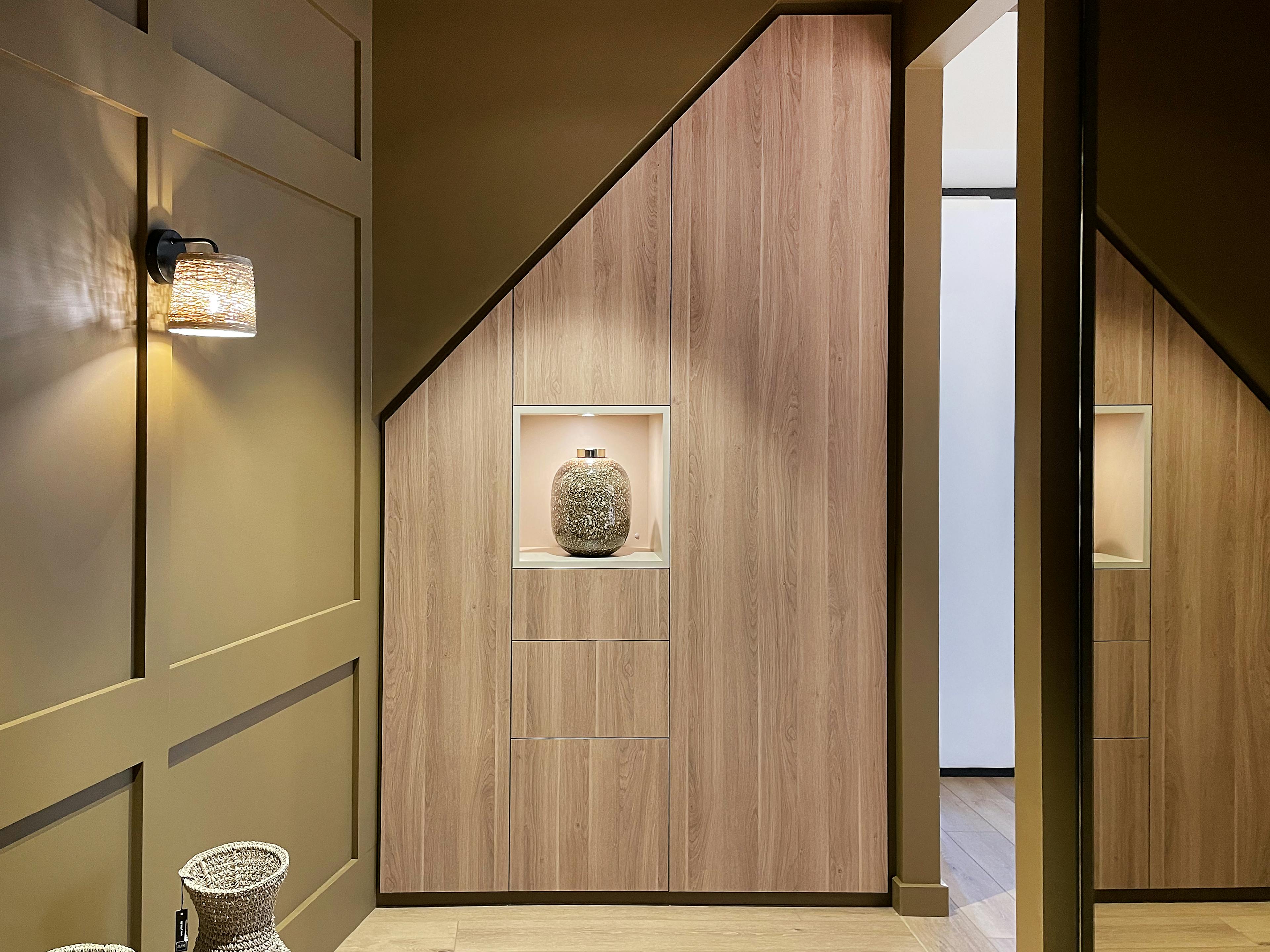 Placard en sous-pente idéal en sous-escalier, façades claires et niche décorative.