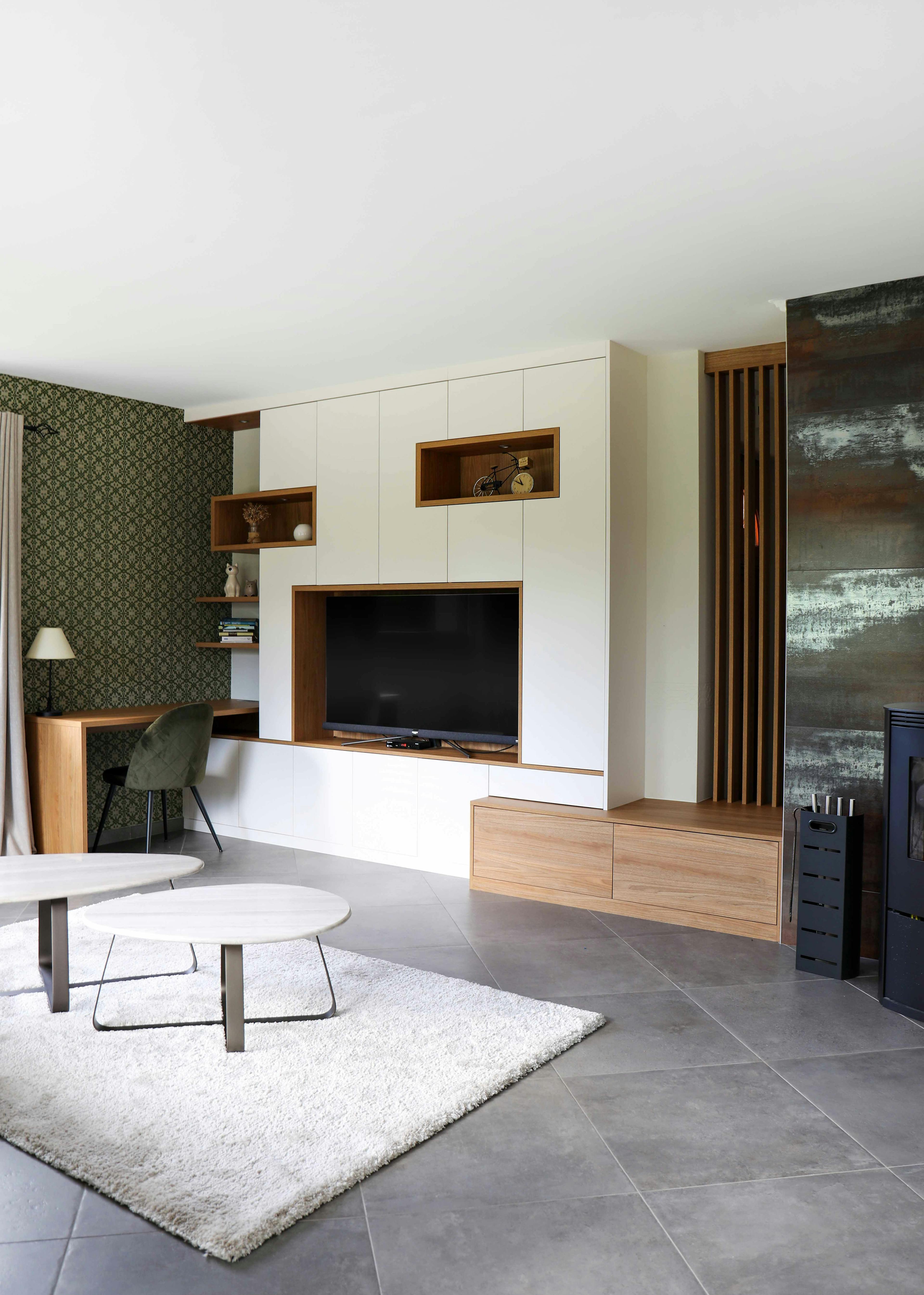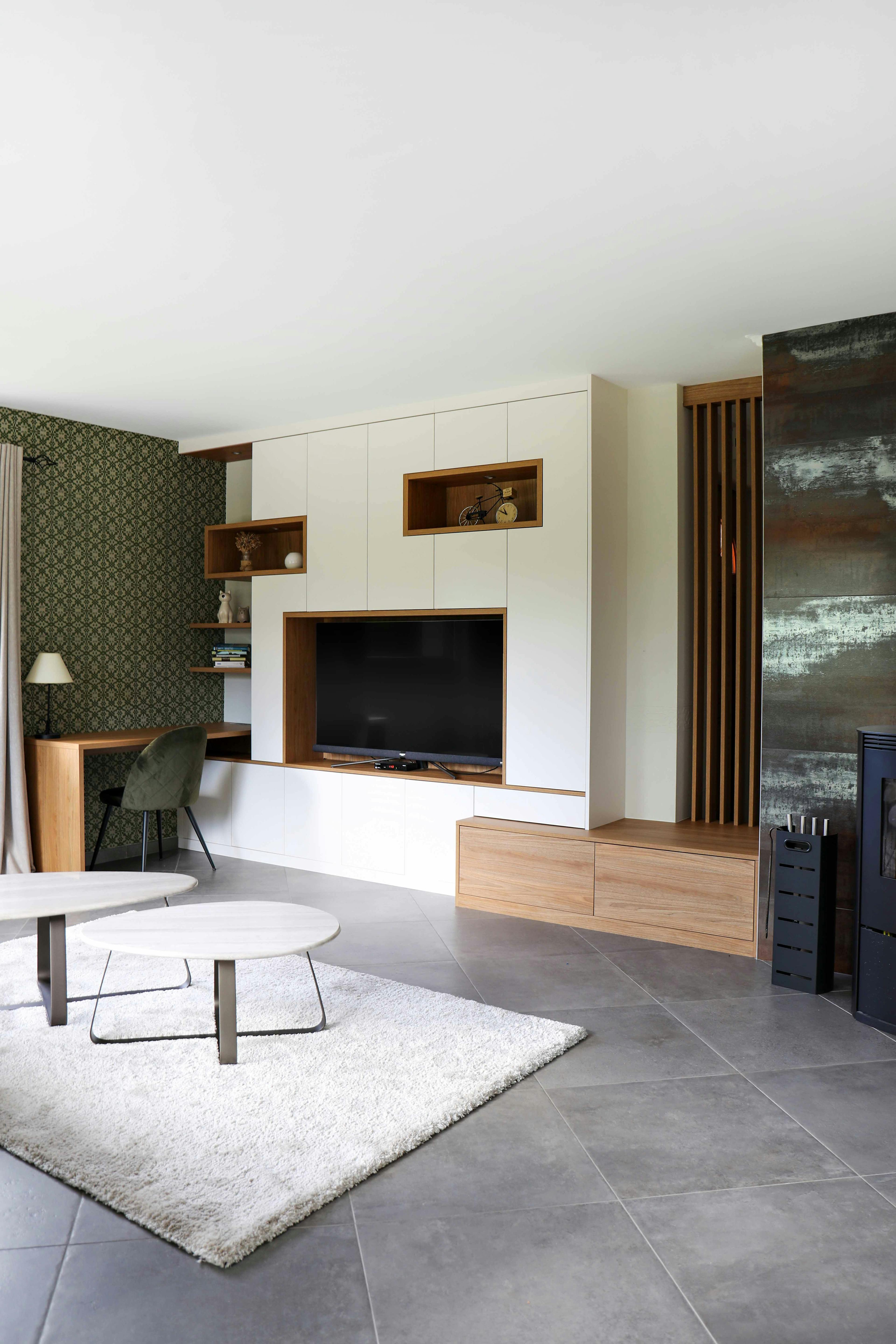 À gauche du meuble TV, l’aménagement se prolonge naturellement par un bureau intégré. Une solution idéale pour intégrer un espace de travail dans le salon sans alourdir la pièce.