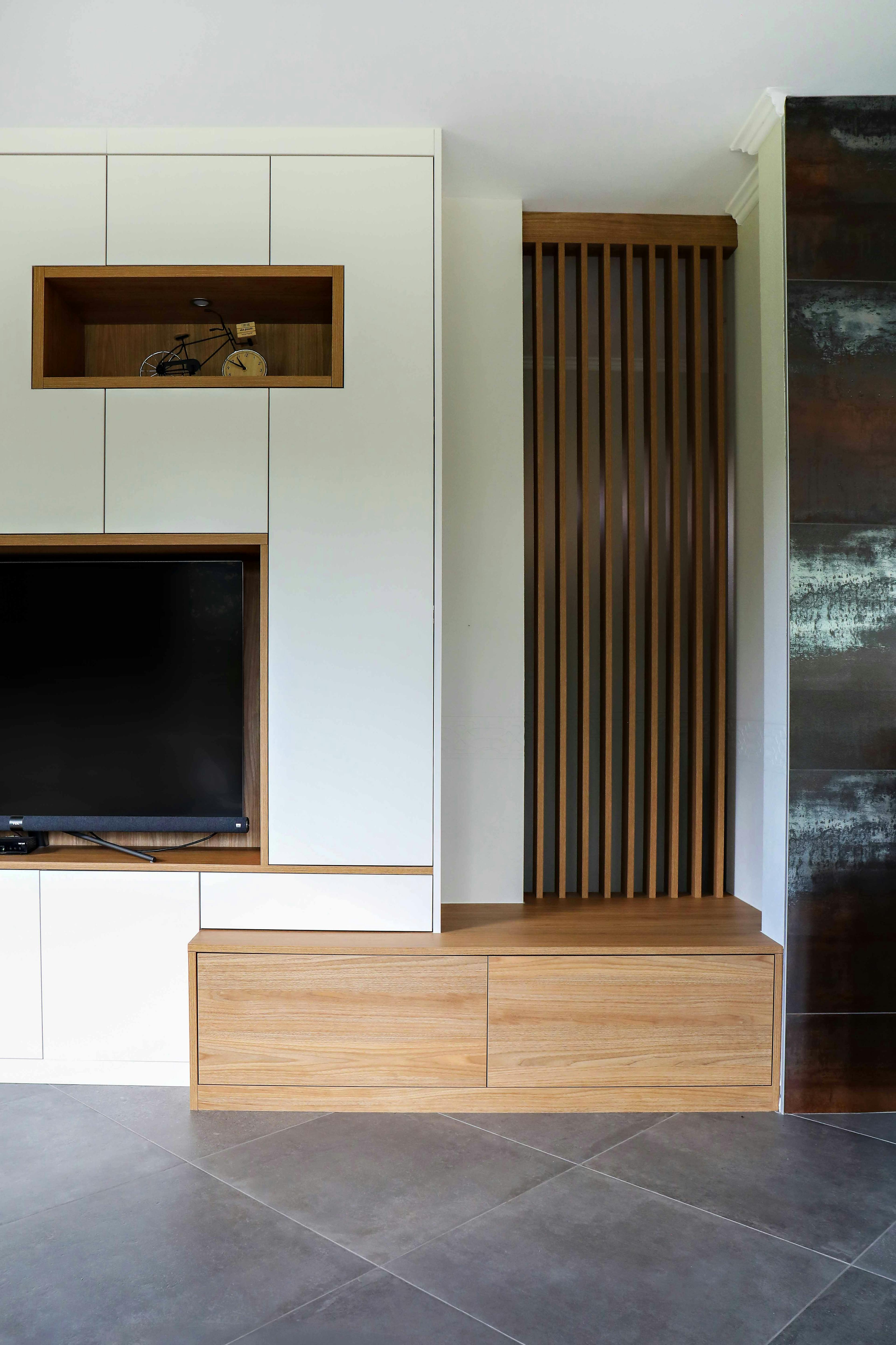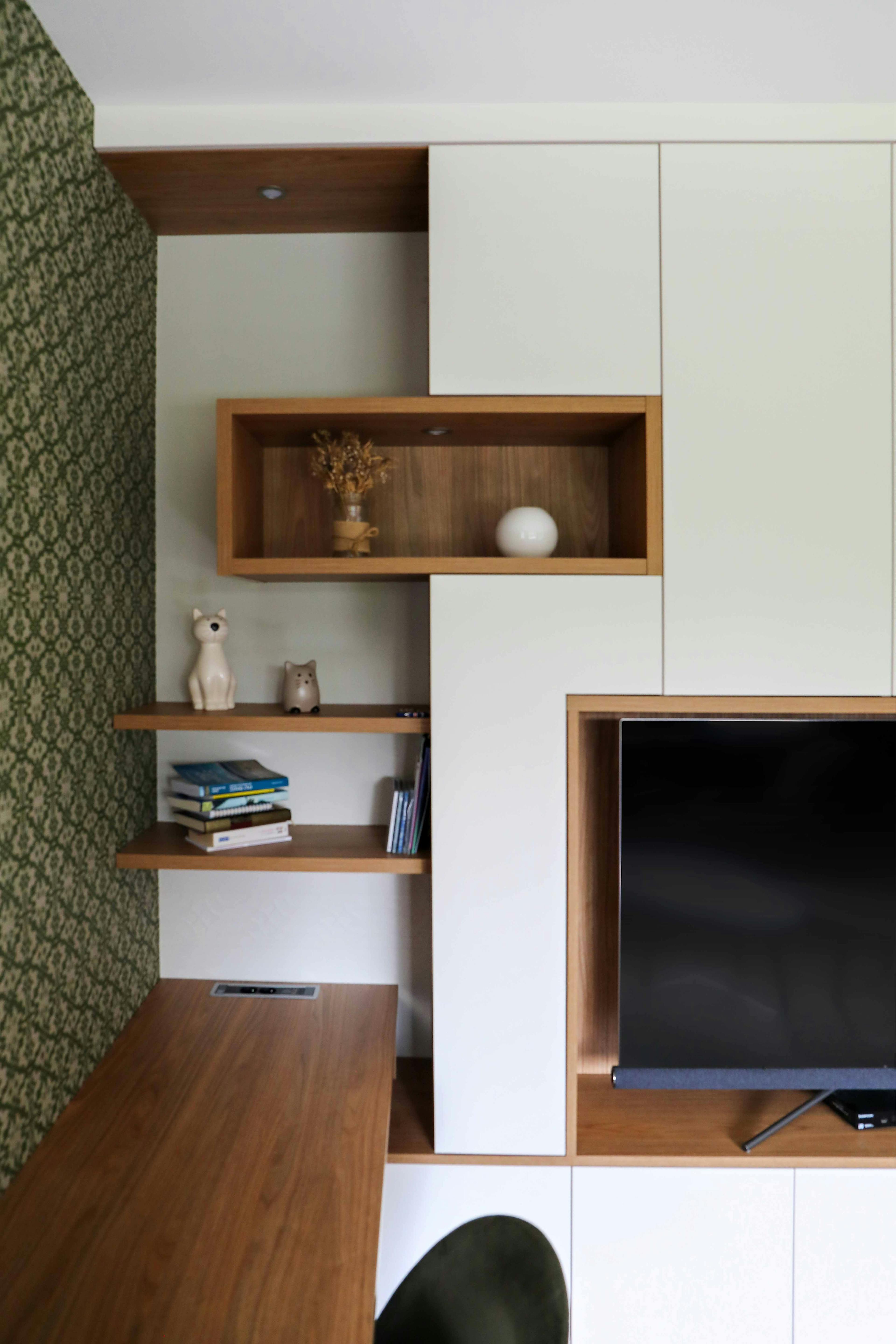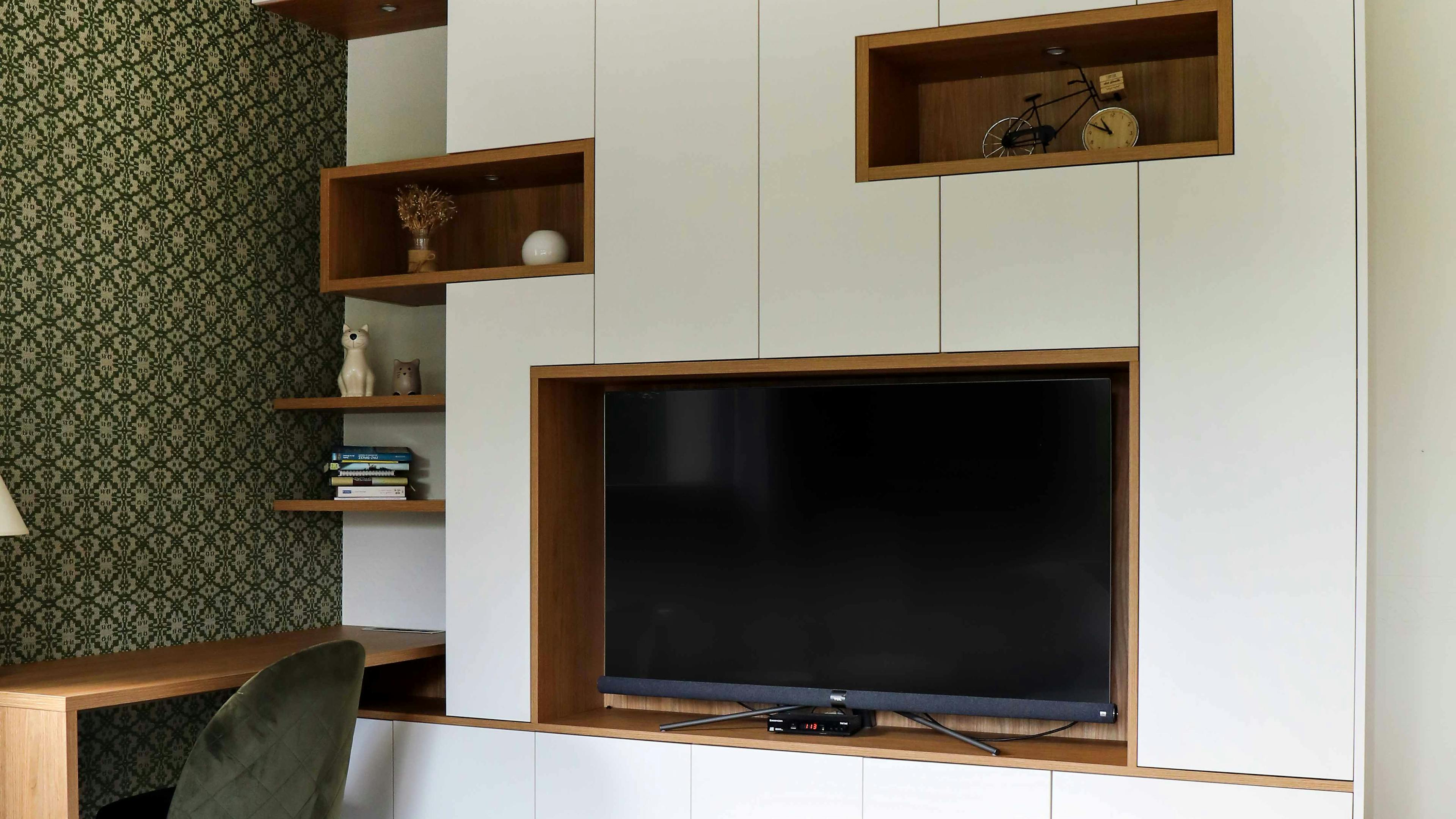 Les lignes sont simples, droites, parfaitement alignées. Rien ne dépasse. Cette sobriété met en valeur la télévision, intégrée dans une niche encadrée d’un décor bois chaleureux.