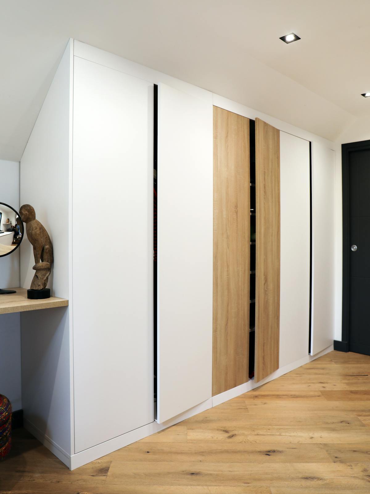 Le sur-mesure permet justement d’adapter le placard : aux dimensions exactes de votre pièce, à vos besoins de rangement, à vos contraintes d’ouverture, et à votre style de vie.