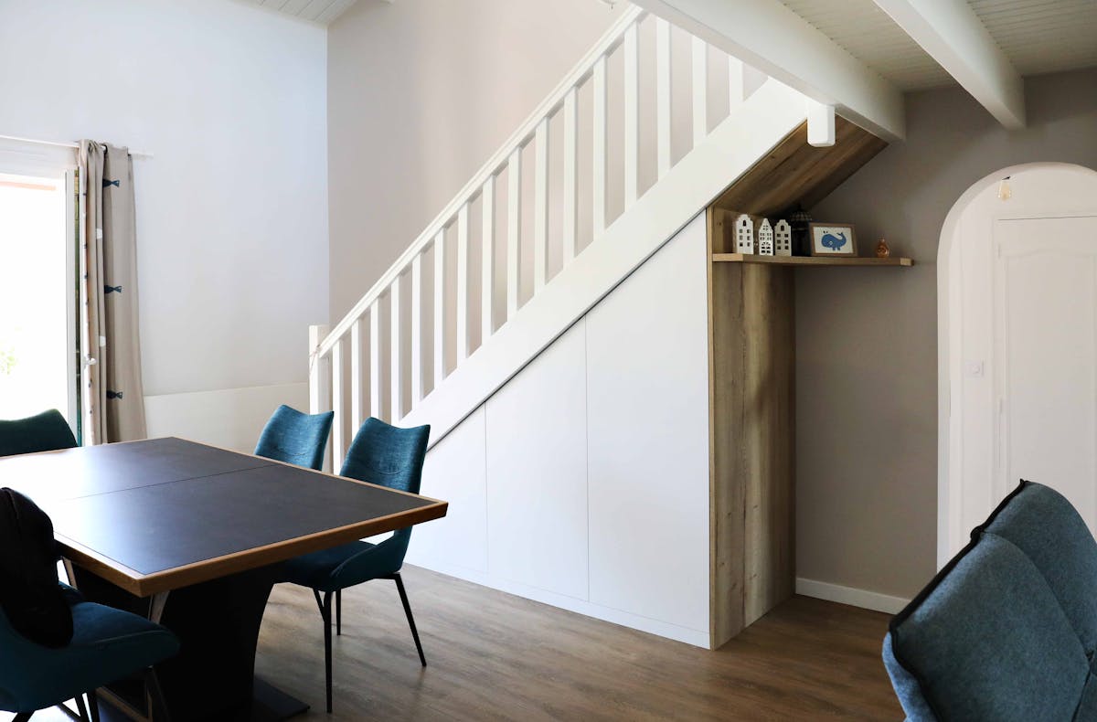 Un espace sous-escalier est idéal pour intégrer des rangements malins. Placards coulissants, casiers modulables ou tiroirs profonds : nos menuisiers conçoivent des solutions astucieuses qui facilitent votre quotidien.