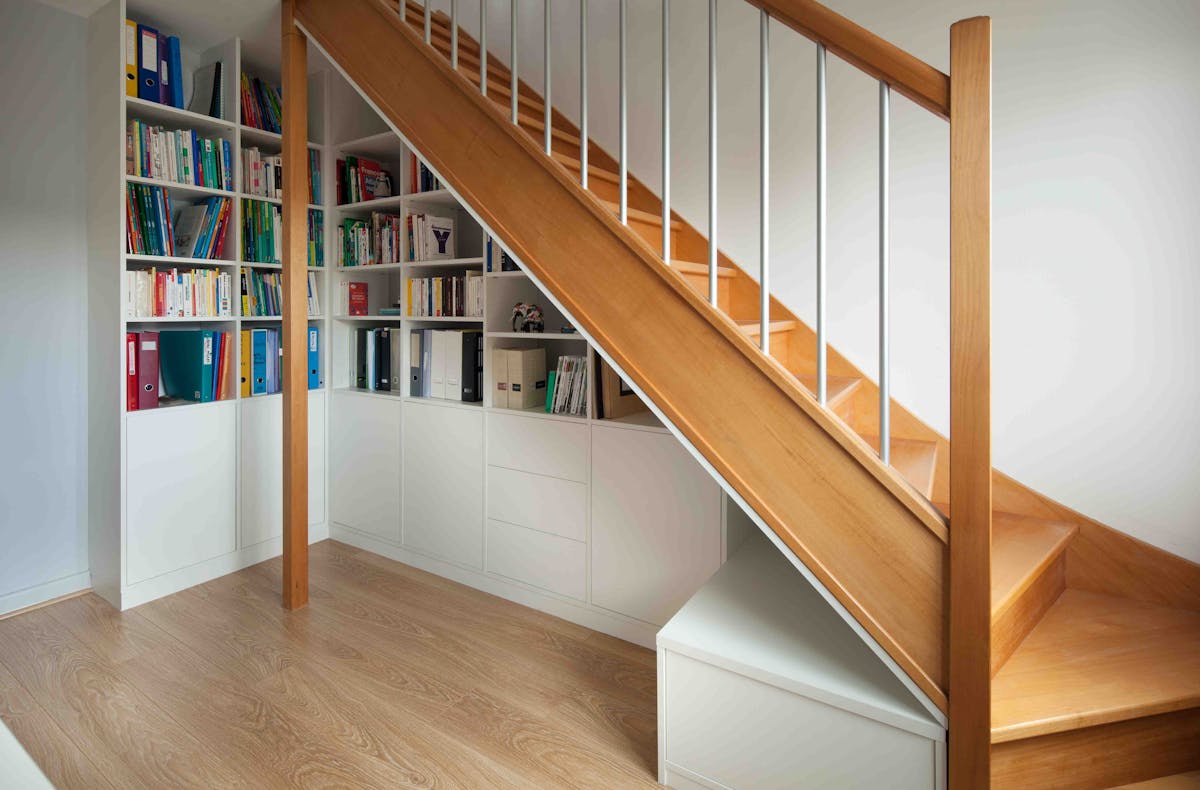 Chaque escalier est unique en termes de dimensions et de configuration. Grâce au savoir-faire de nos architectes et menuisiers, nous concevons des meubles qui exploitent chaque recoin de cet espace souvent complexe, que ce soit avec des tiroirs coulissants, des niches ouvertes ou des placards ajustés à la pente.