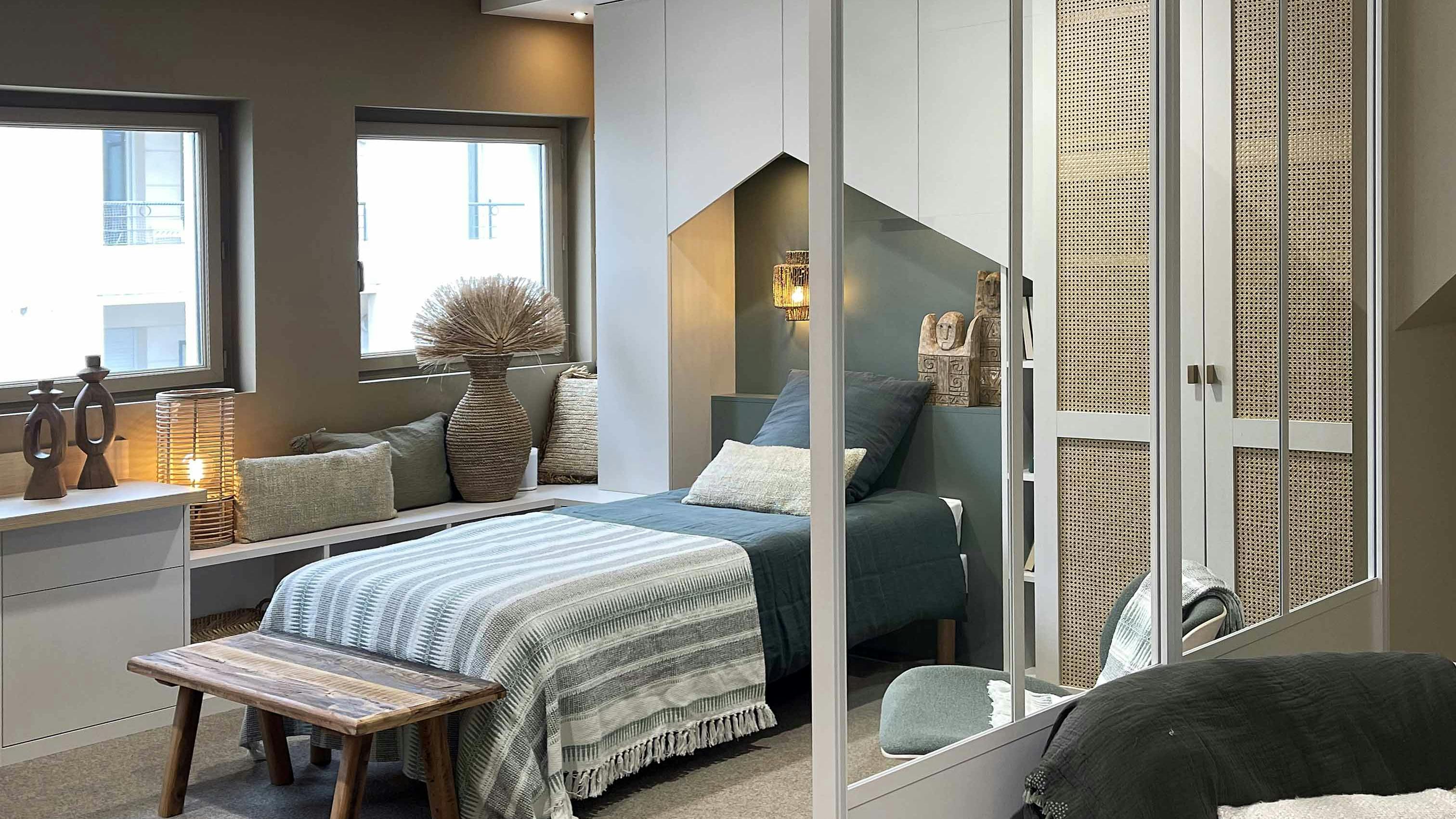 Si la configuration le permet, une cloison vitée entre la chambre et une salle d'eau peut créer un ensemble harmonieux. Pour l'intimité, il est possible d'opter pour des verres texturés ou un jeu de rideaux intégrés.