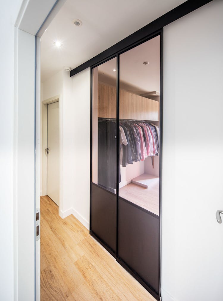 Un dressing sur mesure derrière une cloison vitrée permet d'avoir un espace fonctionnel et esthétique, avec une mise en valeur des vêtements et accessoires. L'ajout de verre dépoli ou teinté assure plus d'intimité tout en profitant de la clarté ambiante.
