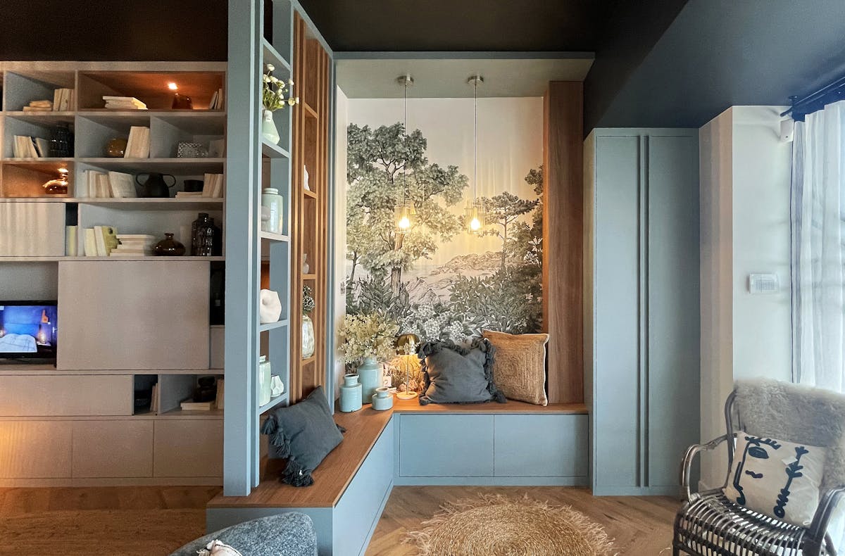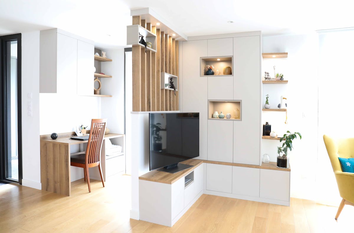 C’est une option très prisée pour séparer l’entrée d’un salon : un meuble bibliothèque sur-mesure, avec des niches ouvertes de part et d’autre. Elle permet de ranger vos livres et objets décoratifs tout en laissant passer la lumière et en préservant la sensation d’espace.
