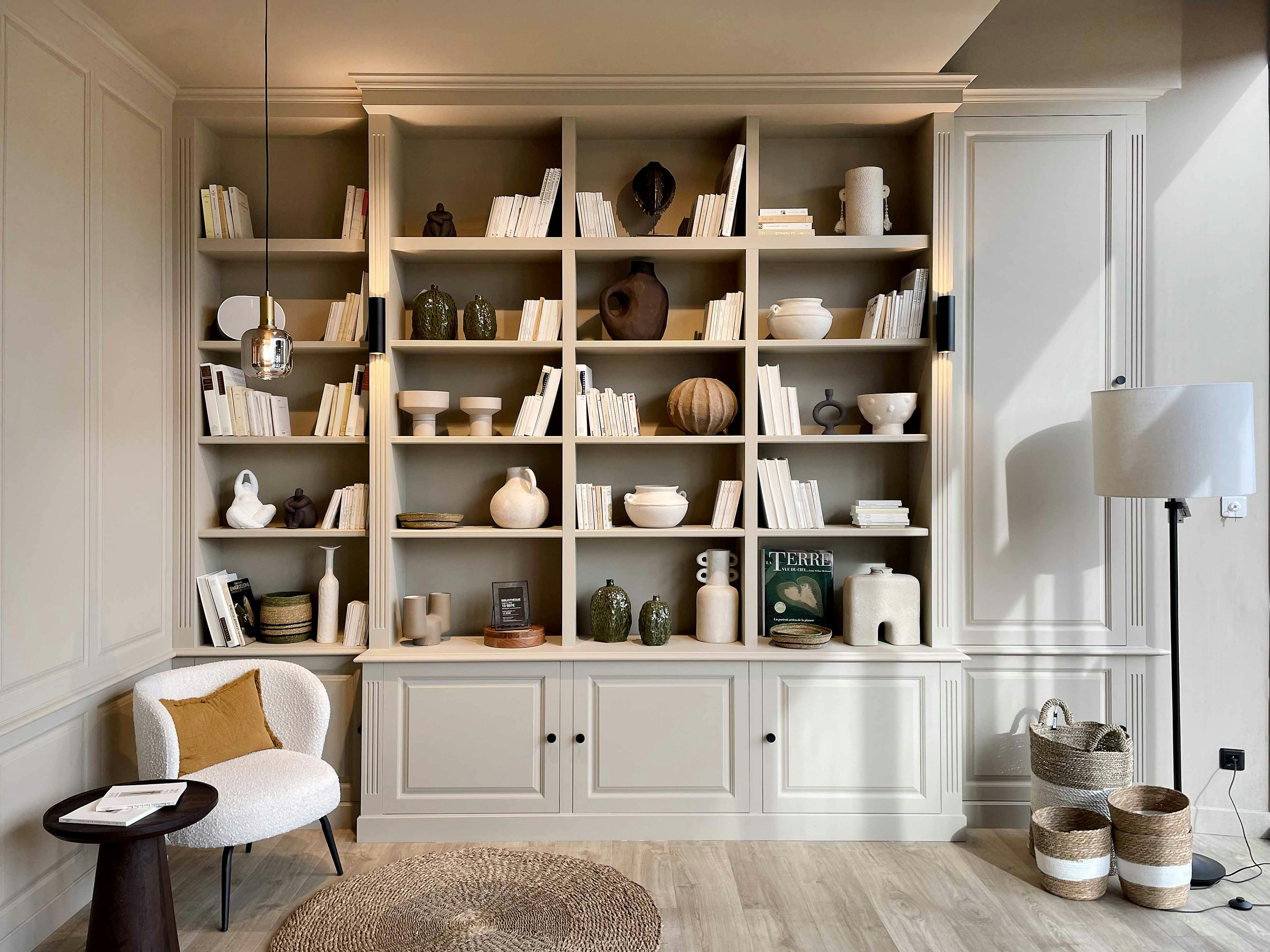 La bibliothèque est un symbole du style traditionnel. Conçue sur-mesure, elle structure un salon tout en offrant un espace de rangement élégant et pratique. Intégrer des niches ouvertes, des portes cannées ou des pilastres permet de marier authenticité et modernité. Chaque élément est pensé pour répondre aux besoins spécifiques du client, avec des finitions qui respectent les codes classiques tout en apportant une touche contemporaine.