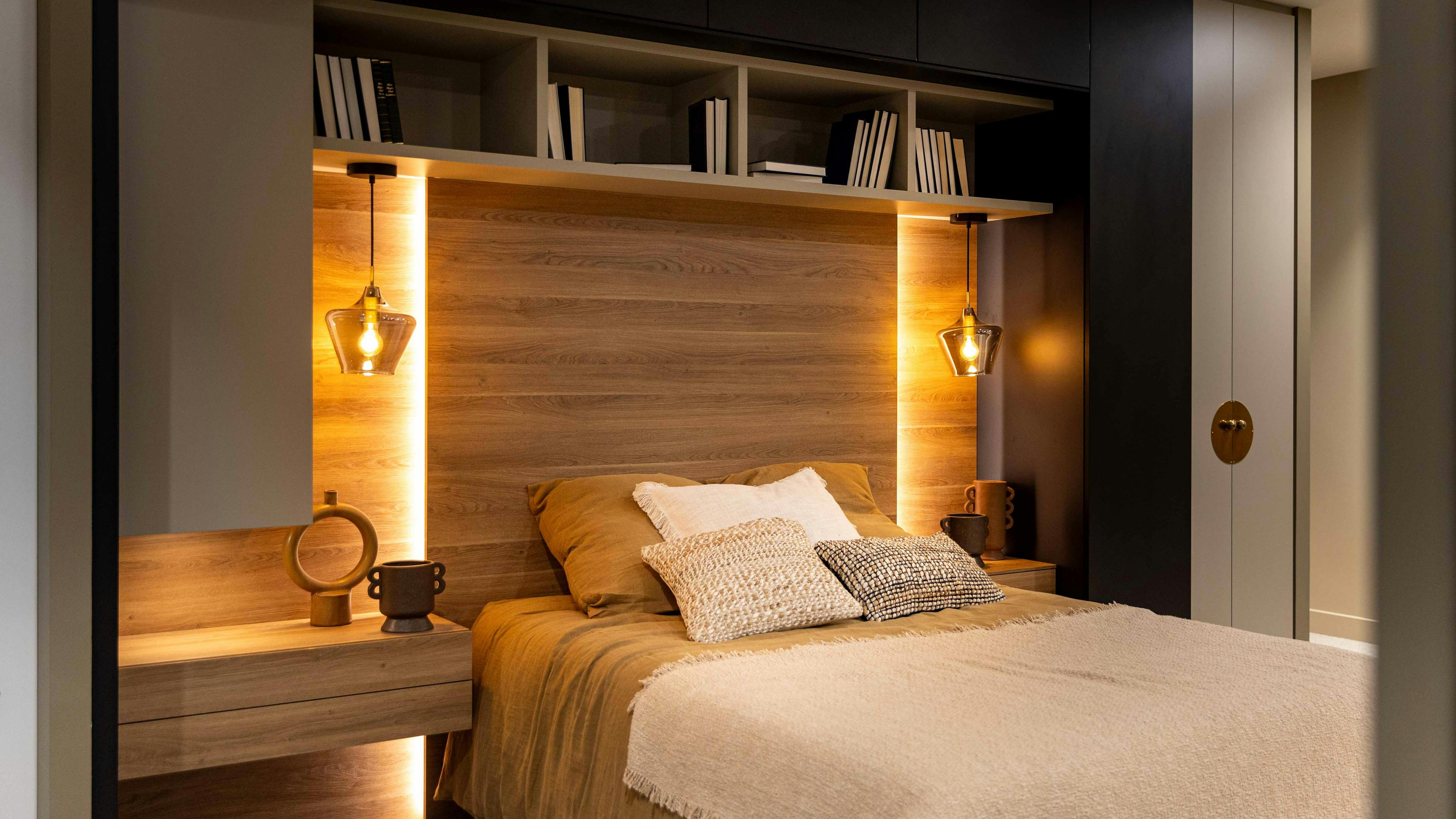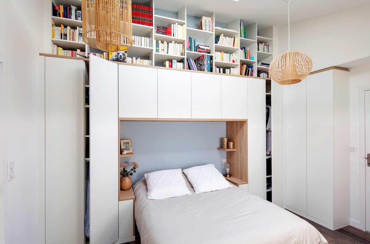 Le lit pont est un type d’aménagement qui associe un lit à une structure de rangements disposée autour et au-dessus de l’espace nuit. Le principe est simple : le lit se glisse sous une “arche” composée de placards, d’étagères ou de bibliothèques, créant ainsi un espace à la fois cosy et ultra-fonctionnel.