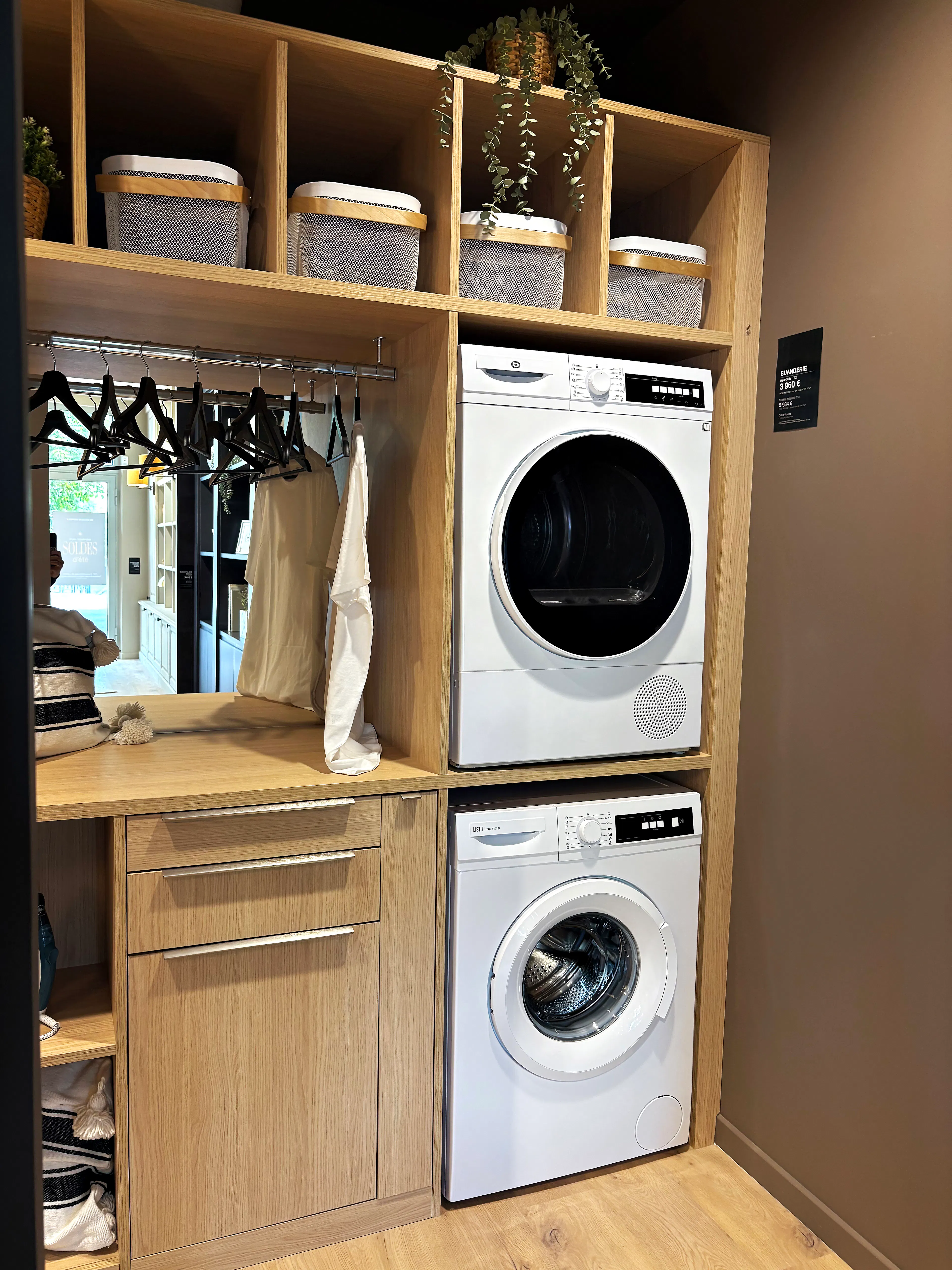 Sans un aménagement bien pensé, cette pièce peut rapidement devenir encombrée et difficile à utiliser. Les machines prennent de la place, les paniers s’accumulent, les produits ménagers s’entassent et il devient difficile de garder un espace ordonné. C’est précisément pour cette raison que le sur-mesure prend tout son sens. En adaptant chaque élément aux dimensions de la pièce et aux habitudes de vie, il est possible de transformer une simple buanderie en un espace fonctionnel et agréable.