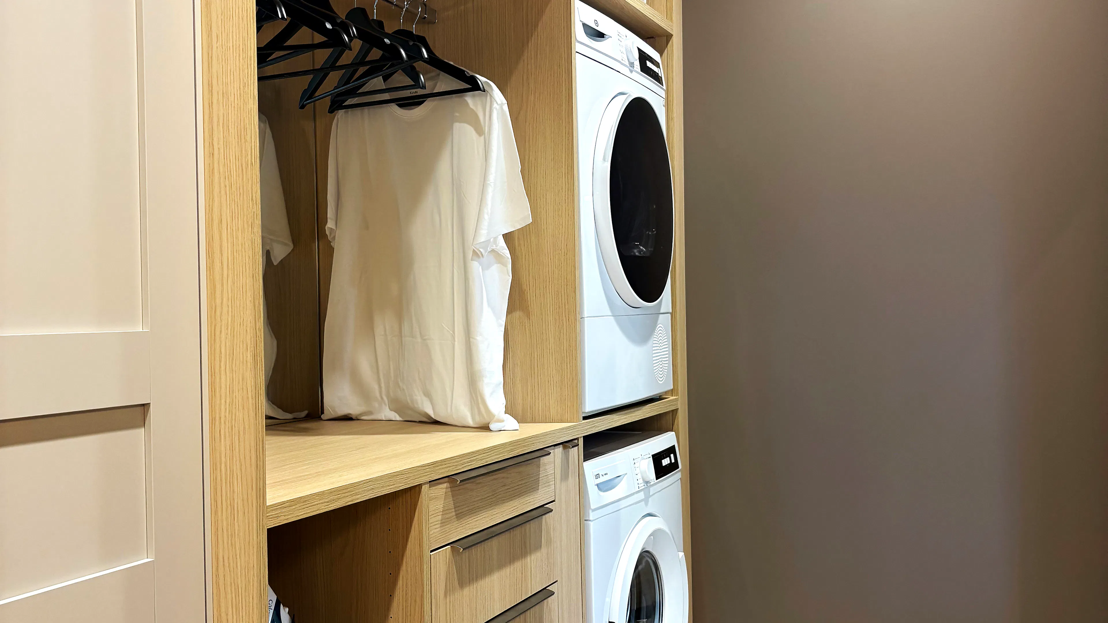 Ici, les architectes d’intérieur ont imaginé une tablette coulissante intégrée directement dans le meuble. Une fois tirée, elle offre une surface d’appoint idéale pour poser un panier de linge, plier quelques vêtements ou préparer le repassage. Lorsqu’elle n’est plus utilisée, elle se replie simplement dans le meuble, libérant ainsi la circulation dans la pièce.