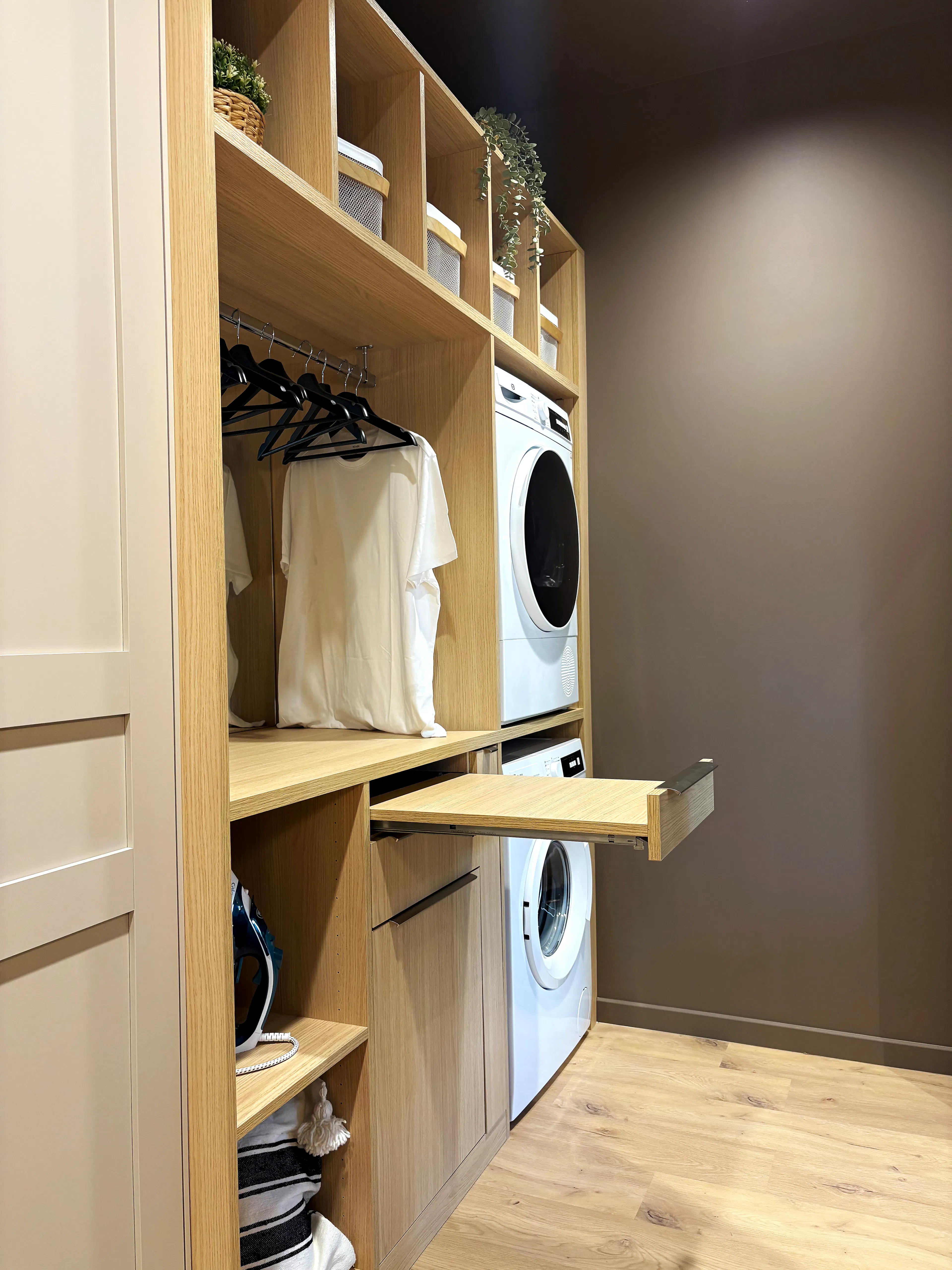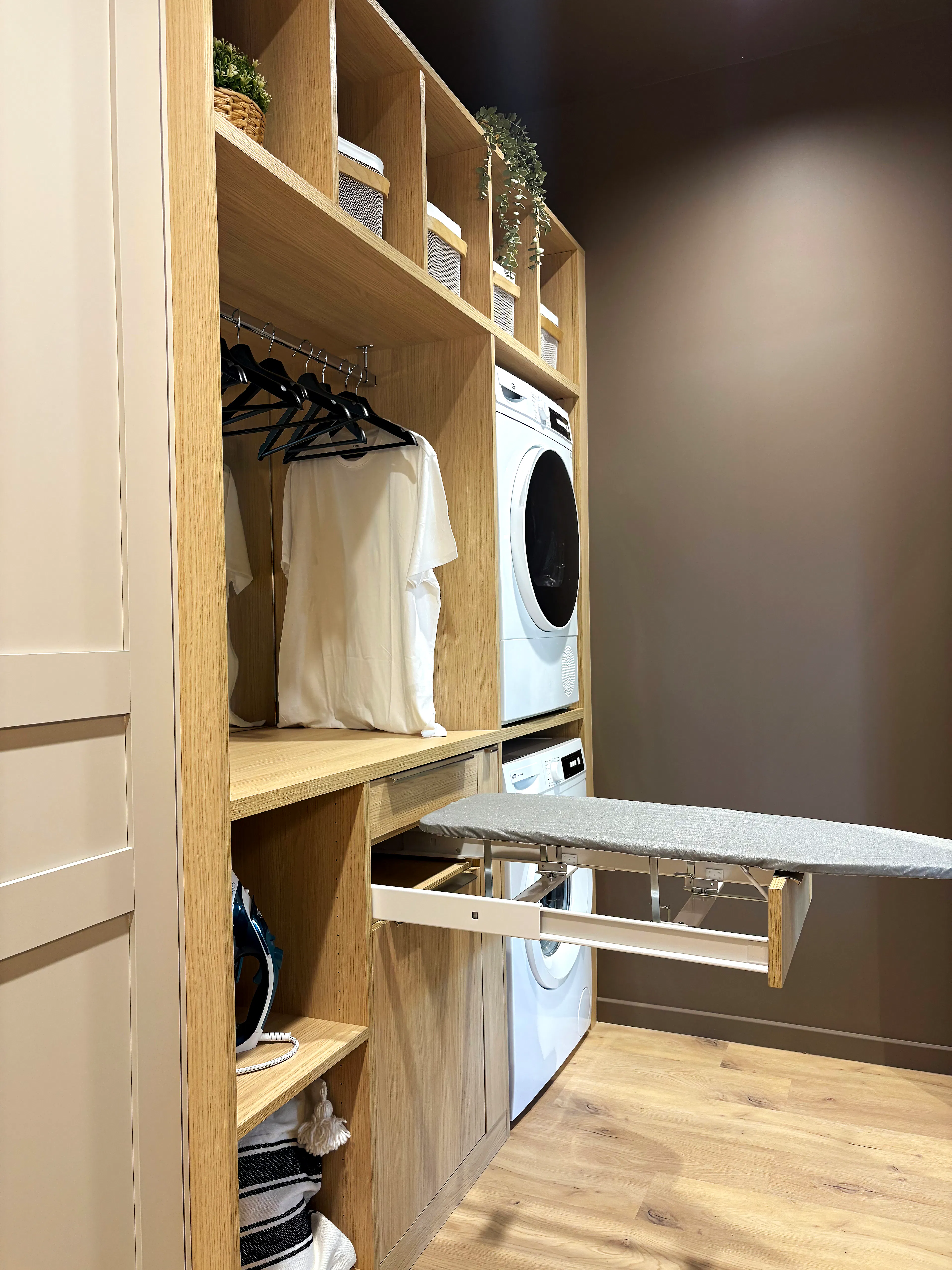 Le repassage est souvent l’une des tâches les plus contraignantes dans la gestion du linge. Sortir la planche, trouver un endroit pour l’installer puis la ranger ensuite peut rapidement devenir fastidieux. Pour simplifier cette étape, cette buanderie intègre une table à repasser escamotable directement dans le meuble.