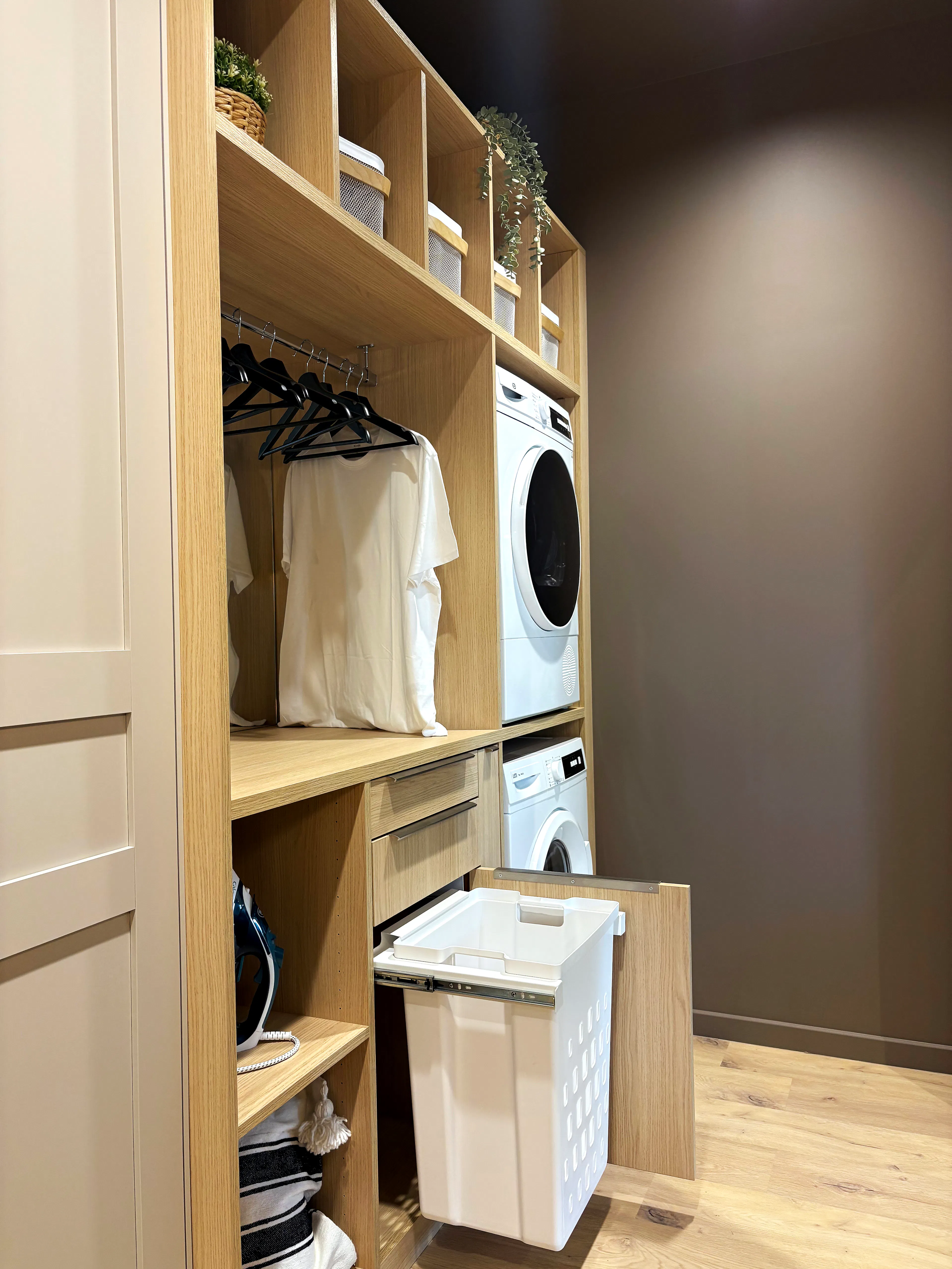 Le panier est monté sur un système coulissant qui permet de le sortir facilement. Cette solution présente plusieurs avantages : le linge sale reste hors de vue, l’espace conserve une apparence ordonnée et l’accès reste très simple au moment de lancer une machine. Une fois refermé, le meuble retrouve une façade parfaitement alignée avec le reste de l’aménagement.