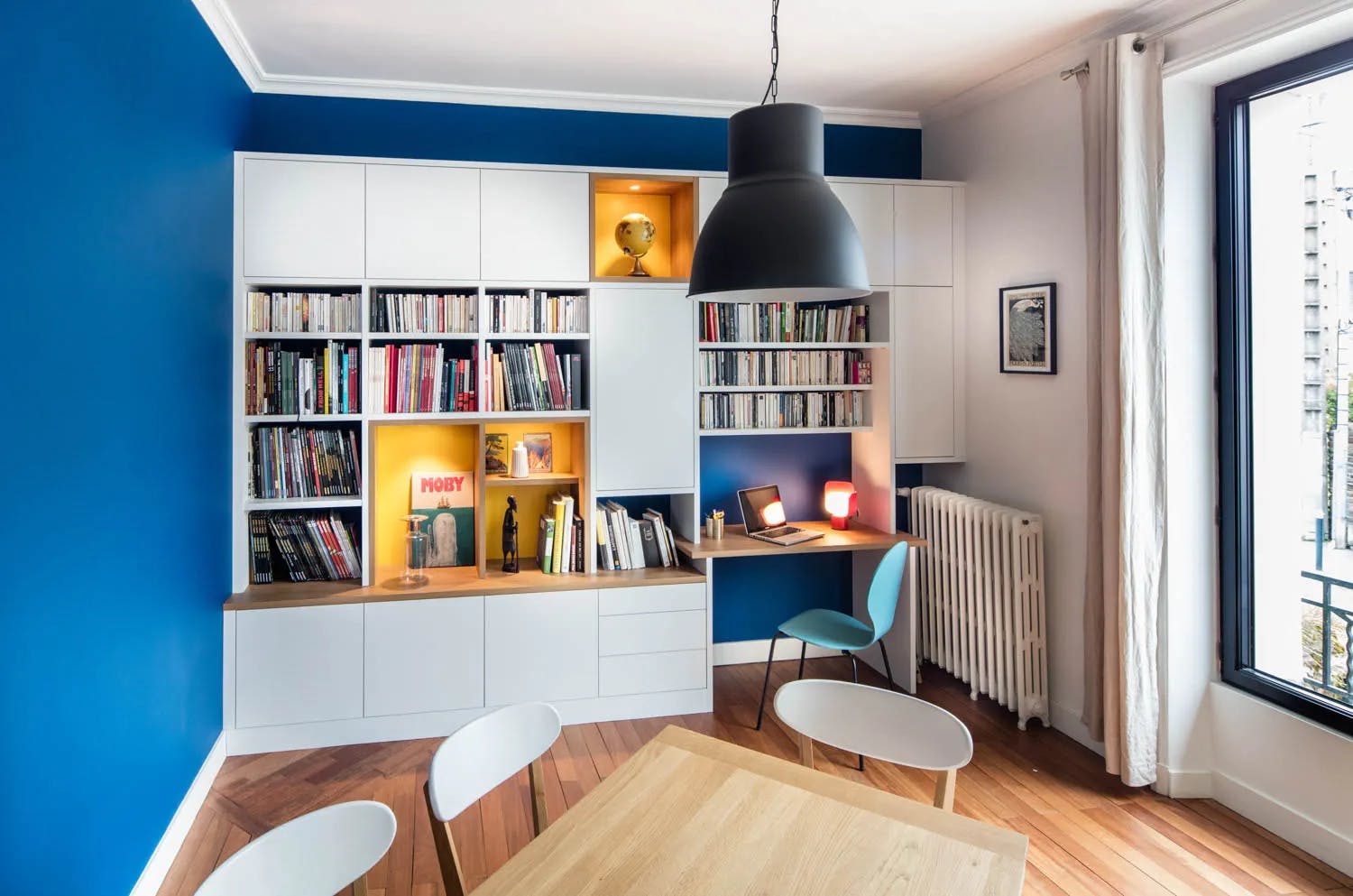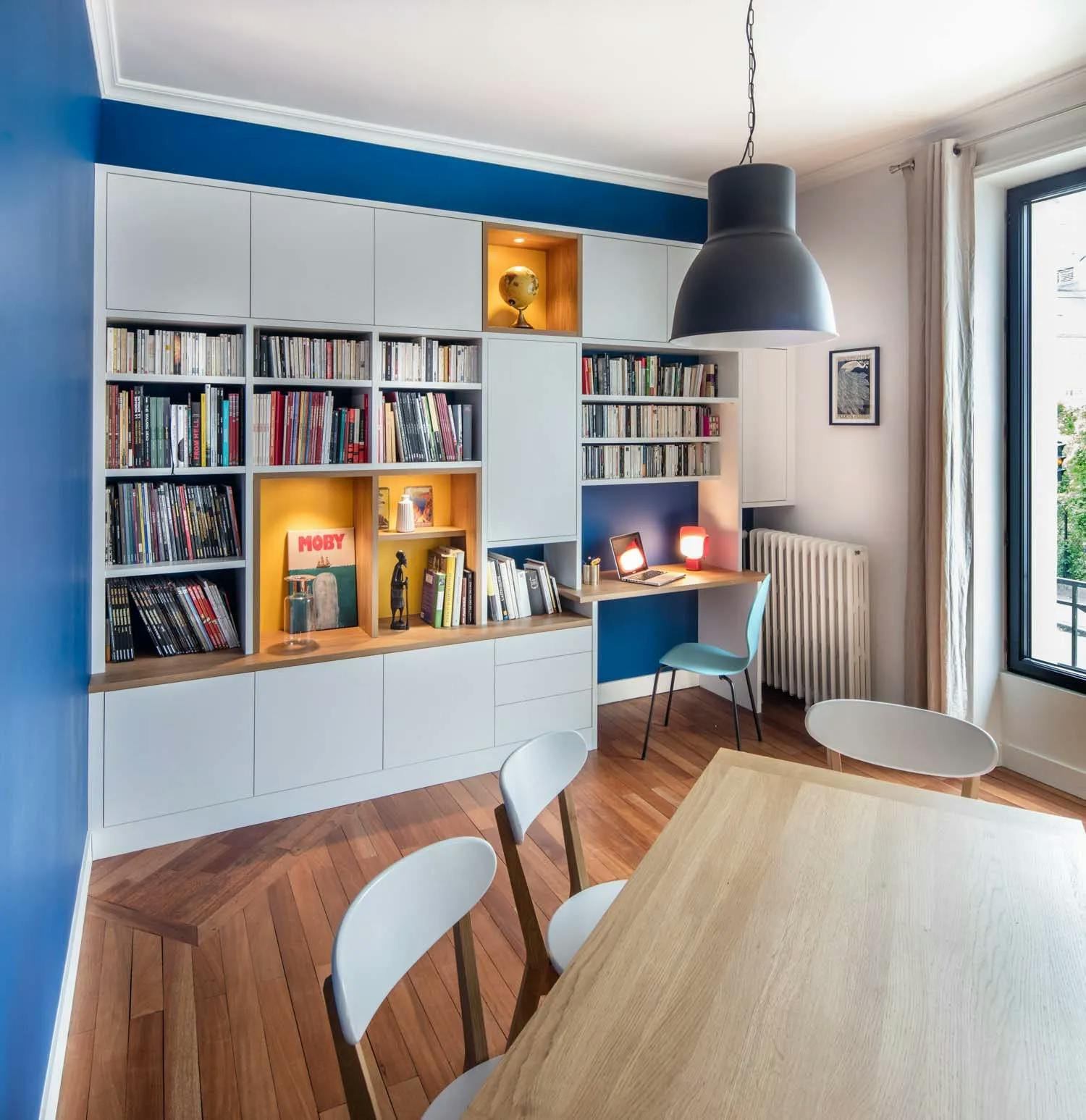 Pour répondre à cette demande, une composition sur mesure a été imaginée, associant des étagères ouvertes pour mettre en valeur les ouvrages et des rangements fermés pour préserver un aspect ordonné. Un coin bureau a été intégré directement dans la structure, offrant un espace de travail ergonomique et bien éclairé. Le choix de niches colorées et d’un éclairage intégré permet de dynamiser l’ensemble et de mettre en avant certains objets décoratifs. Le résultat est une bibliothèque qui allie praticité et design, tout en s’adaptant parfaitement aux contraintes techniques du lieu.